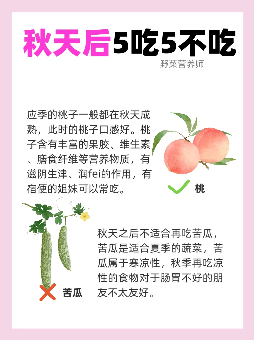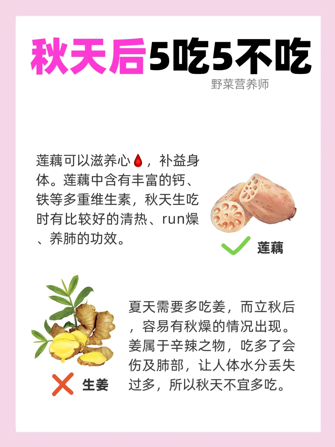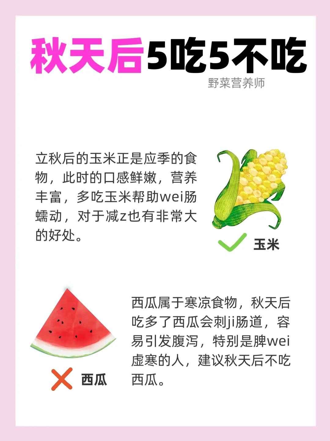 养升的姐妹看过来‼️我们已经正式进入秋天了,然而很多姐妹并不知道,夏天适合吃的食物秋天就变得不太适合了,我给大家总结了5种适合秋天吃的食物和5种秋天不建议吃的食物