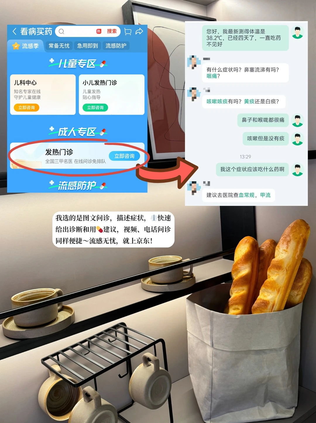 最近赶ddl连轴加班,又遇降温,直接被甲流击倒,发热+浑身酸痛,周围朋友很多中招。去🏥看病,排队三小时、问诊三分钟...实在耗不起,🥼给配了💊,吃了几天好转了;去复诊时真不想挂号排队了...还是室友靠谱,安利我试试京东互联网🏥