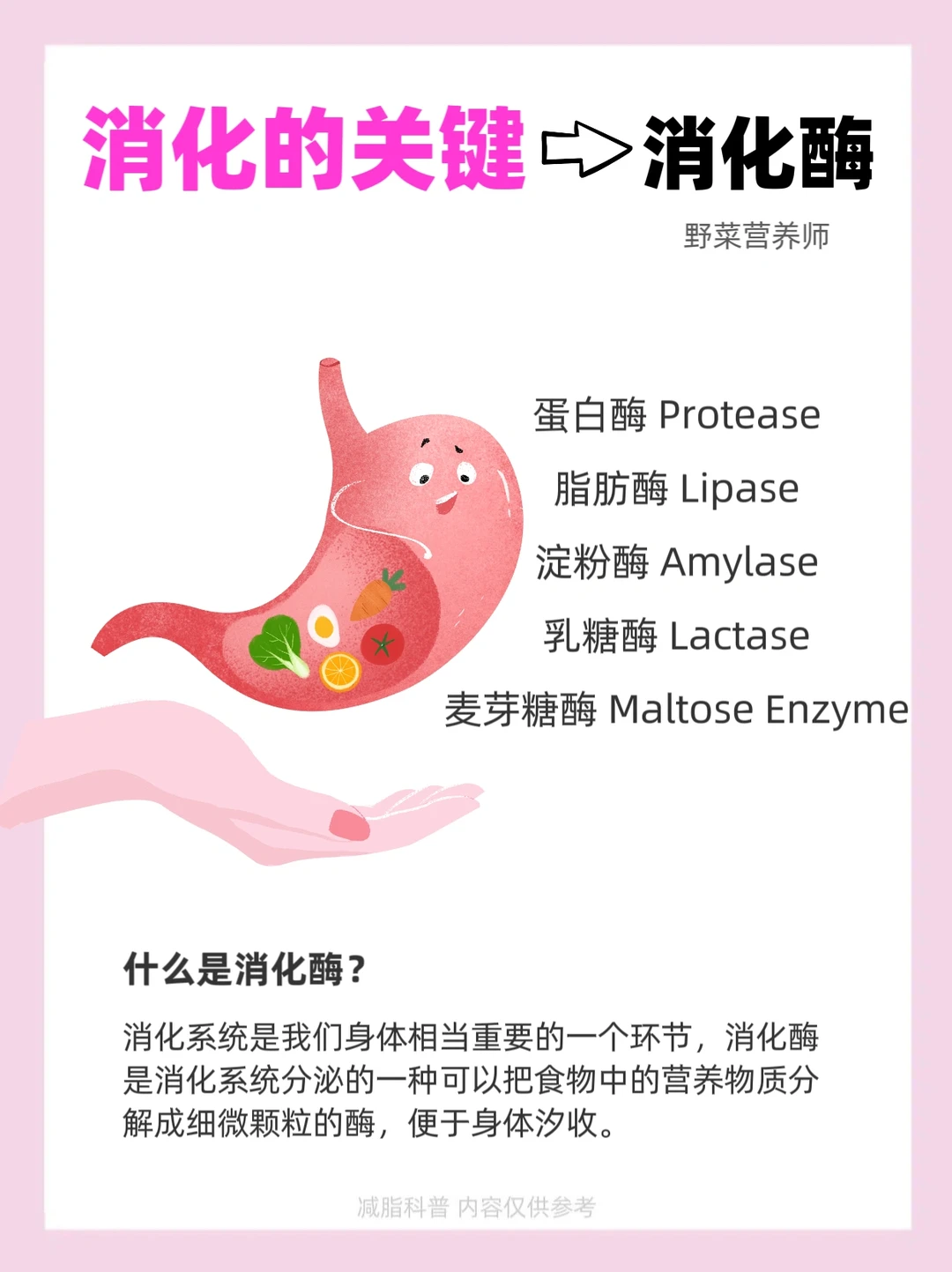 消化酶包括蛋白酶、脂肪酶、淀粉酶、乳糖酶、麦芽糖酶等。消化系统是我们身体相当重要的一个环节,消化酶是消化系统分泌的一种可以把食物中的营养物质分解成细微颗粒的酶,便于身体汐收。