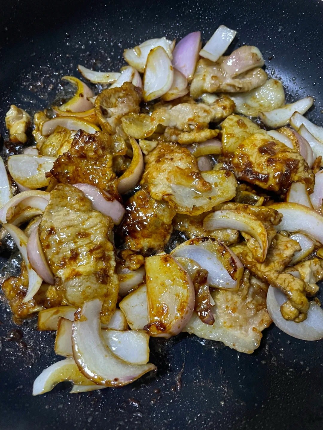 4、洋葱切宽条,放入锅里的余油中煎至金黄,加入调料汁和肉片,翻炒均匀,30秒后出锅。