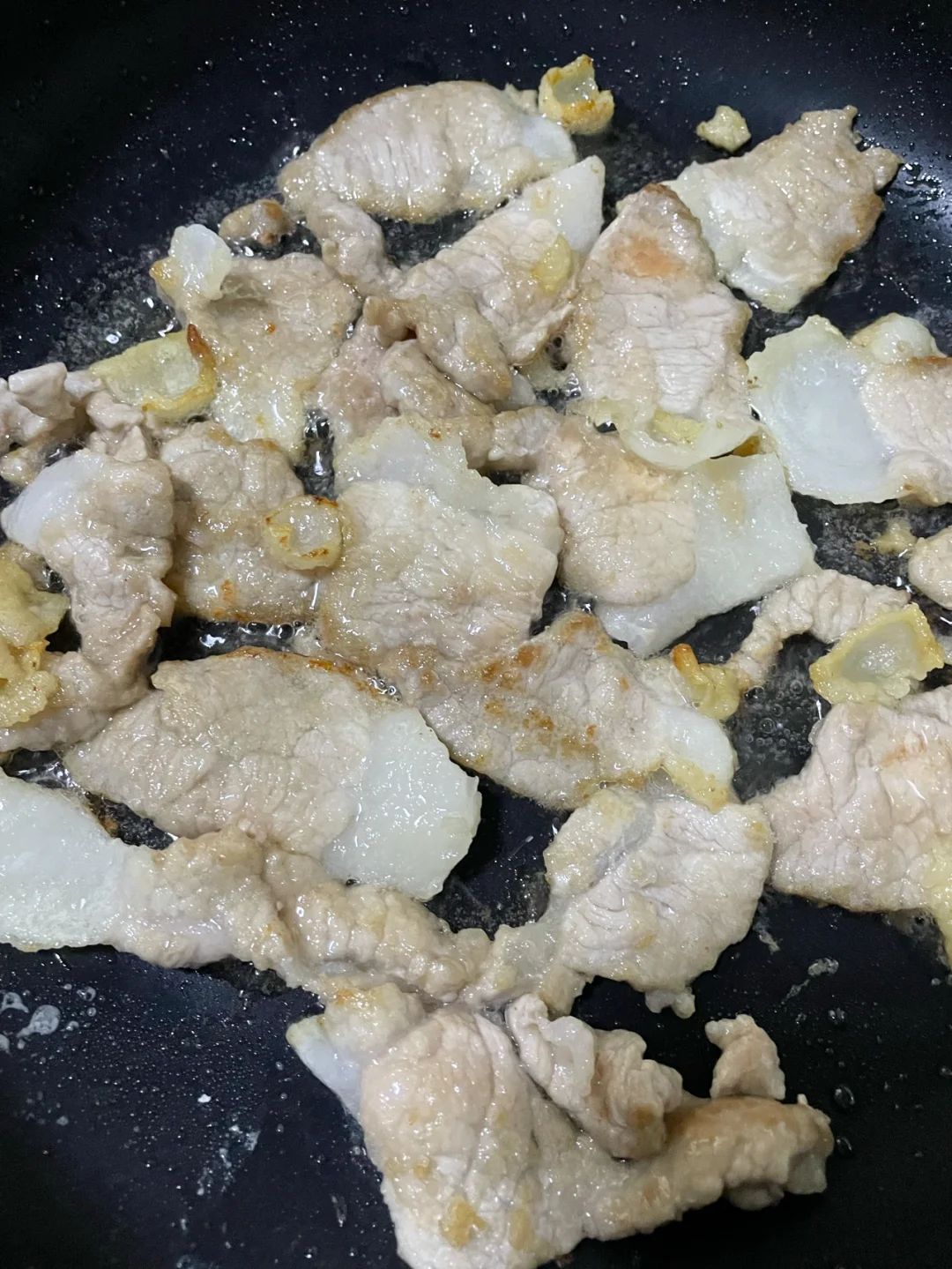3、我把肥肉的部分切下来先用小火煸成油,之后把切好的肉片均匀沾上干面粉(因为我在无麸质饮食期间所以换成玉米淀粉),把肉片平铺在锅中,开中火烧至一面金黄翻面10秒后盛出。