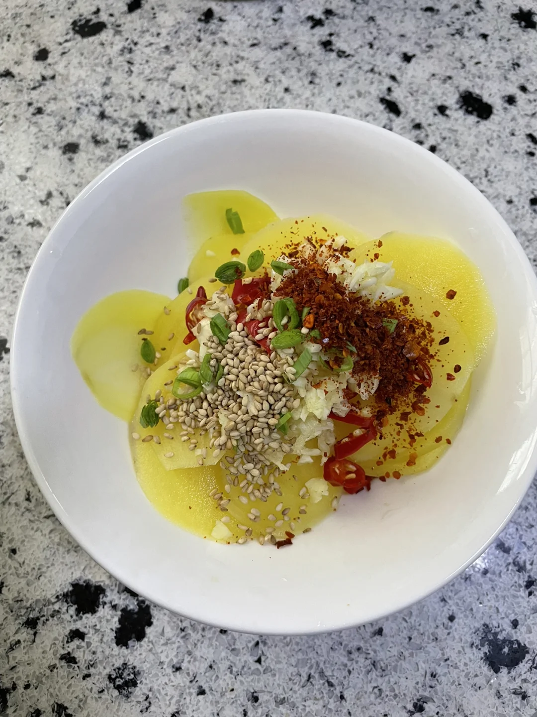 3、土豆上撒蒜末芝麻辣椒粉小葱,滋热油出香味,加入1勺生抽1勺蚝油1勺0卡糖2g盐,拌匀即可
