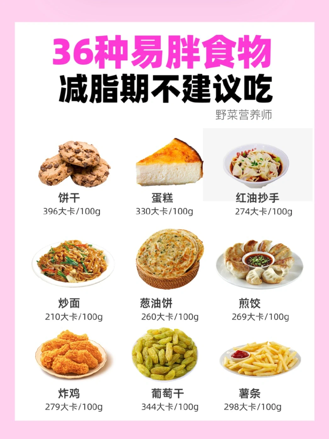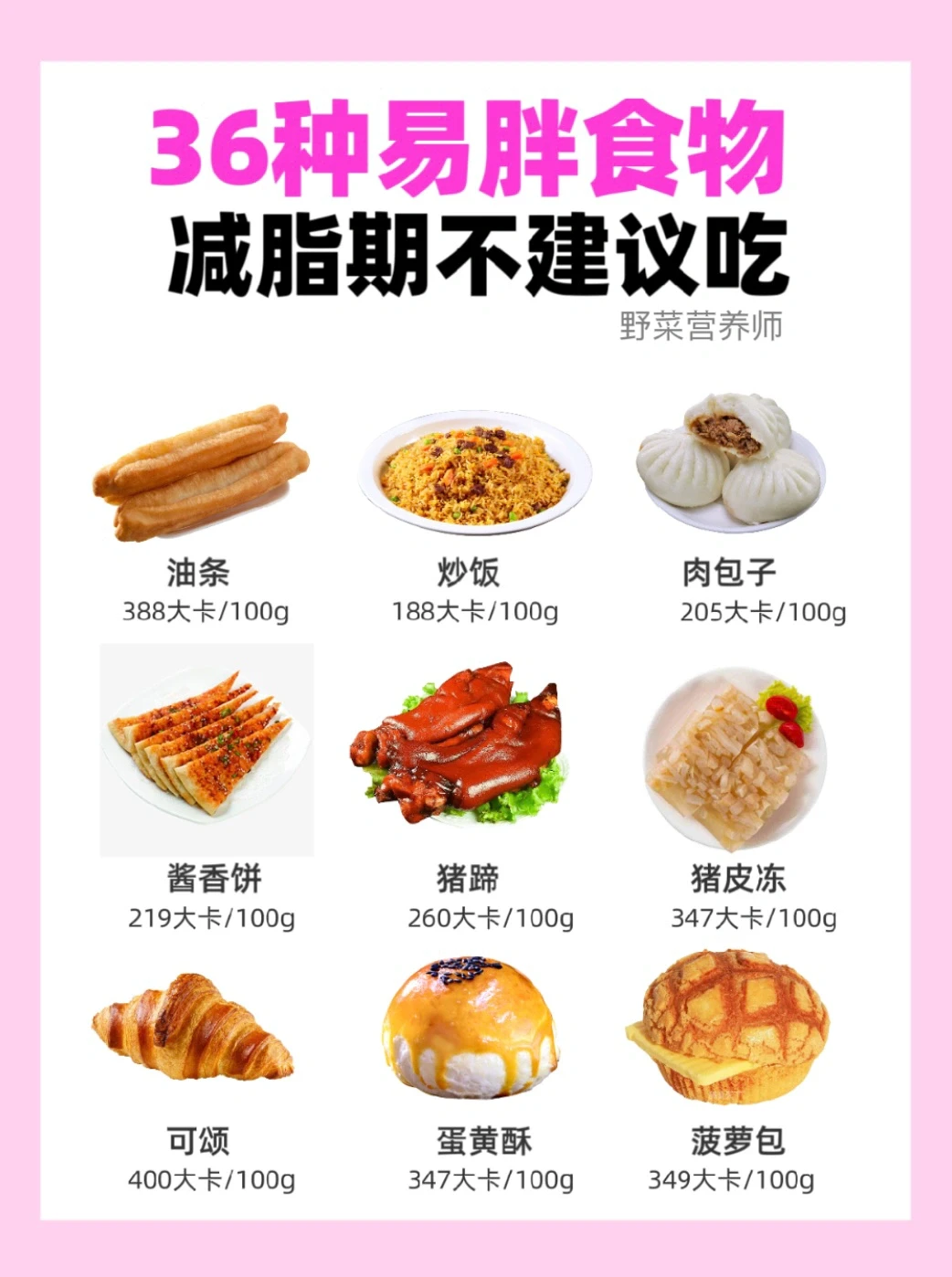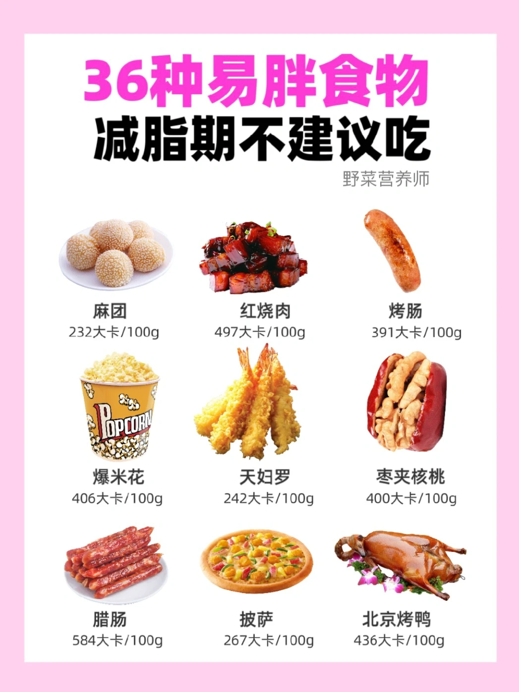 姐妹们,如上图。整理的 36种容易发胖的食物,建议减脂期尽量别吃哦~