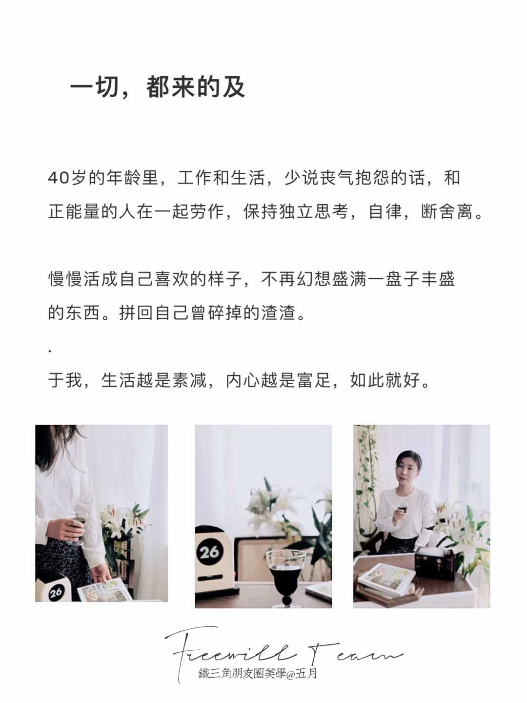 40岁的年龄里,工作和生活,少说丧气抱怨的话,和正能量的人在一起劳作,保持独立思考,自律,断舍离。