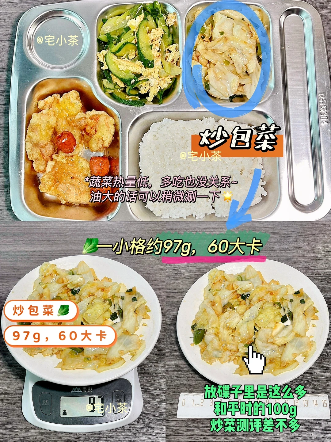 ➡️炒包菜:一小格约97g,60大卡
