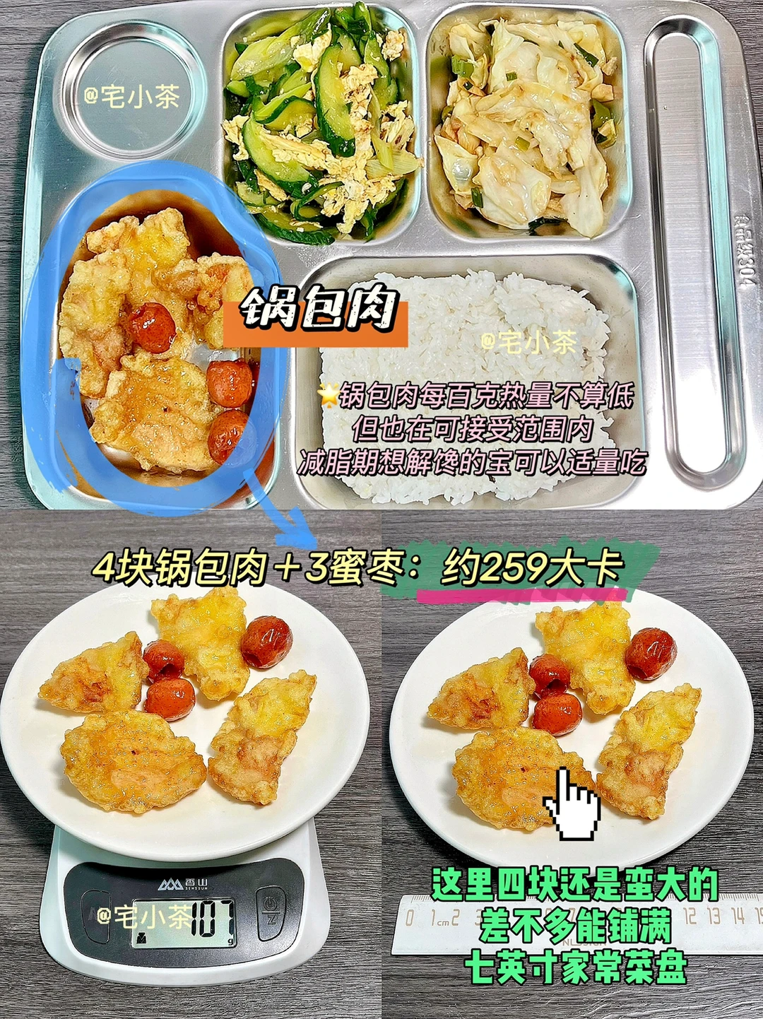 👉总的来说,就算是吃食堂饭菜(量大+油大),甚至是吃锅包肉,热量也是可以控制在一顿500大卡左右的~不必太过担心!