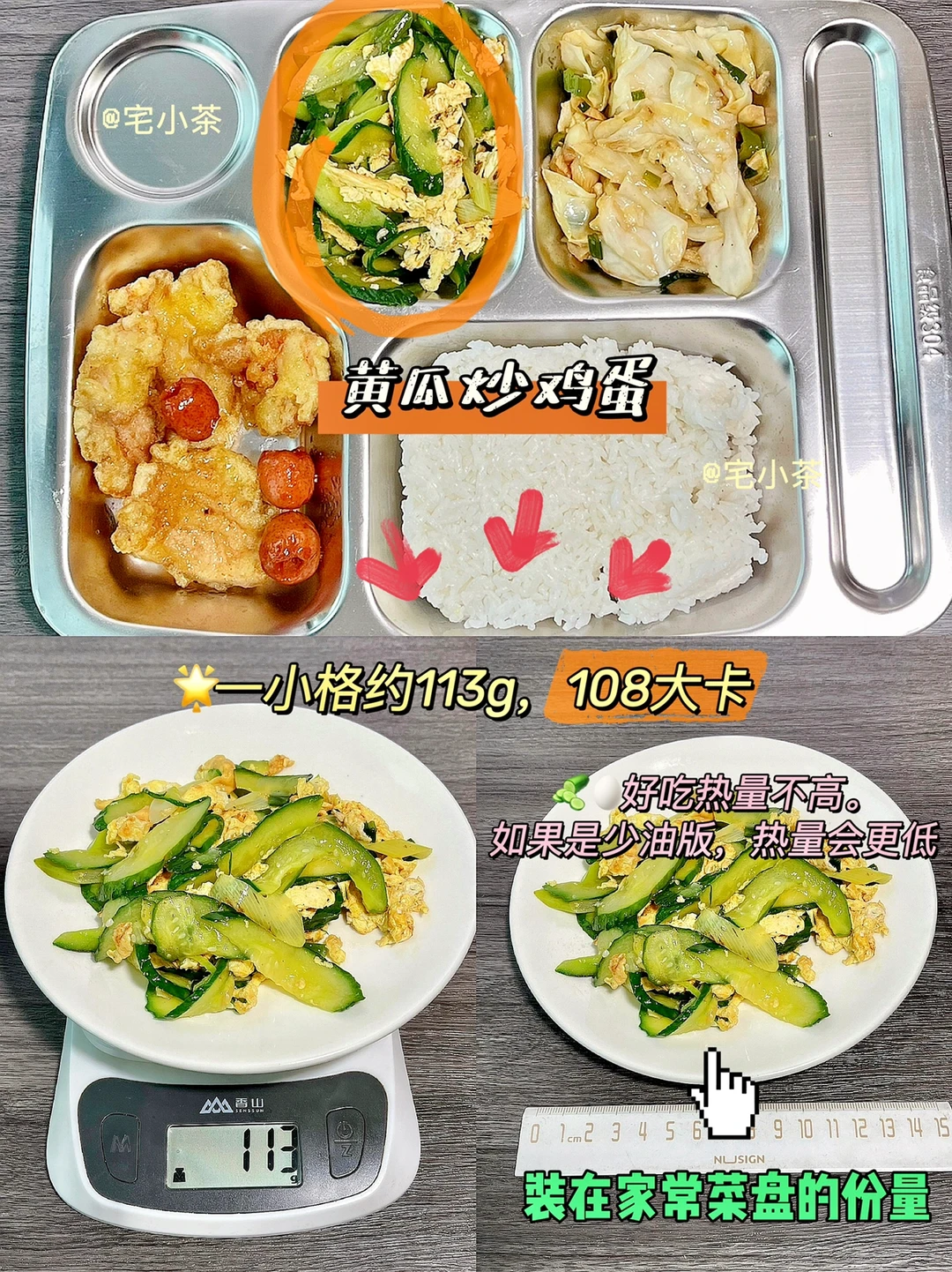 ➡️黄瓜炒鸡蛋:一小格约113g,108大卡