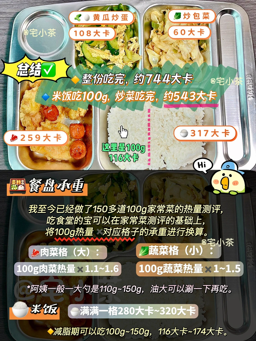 🔹我至今已经做了150多道100g家常菜的热量测评,吃食堂的宝可以在家常菜测评的基础上,将100g热量✖️对应格子的承重进行换算。