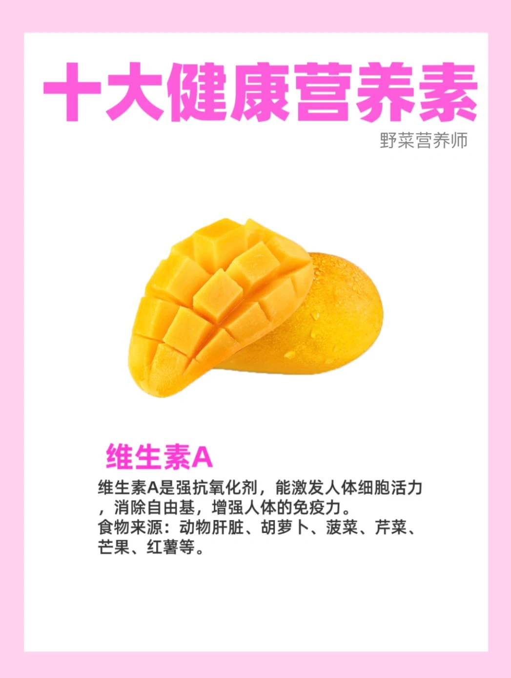 食物来源:动物肝脏、胡萝卜、菠菜、芹菜、芒