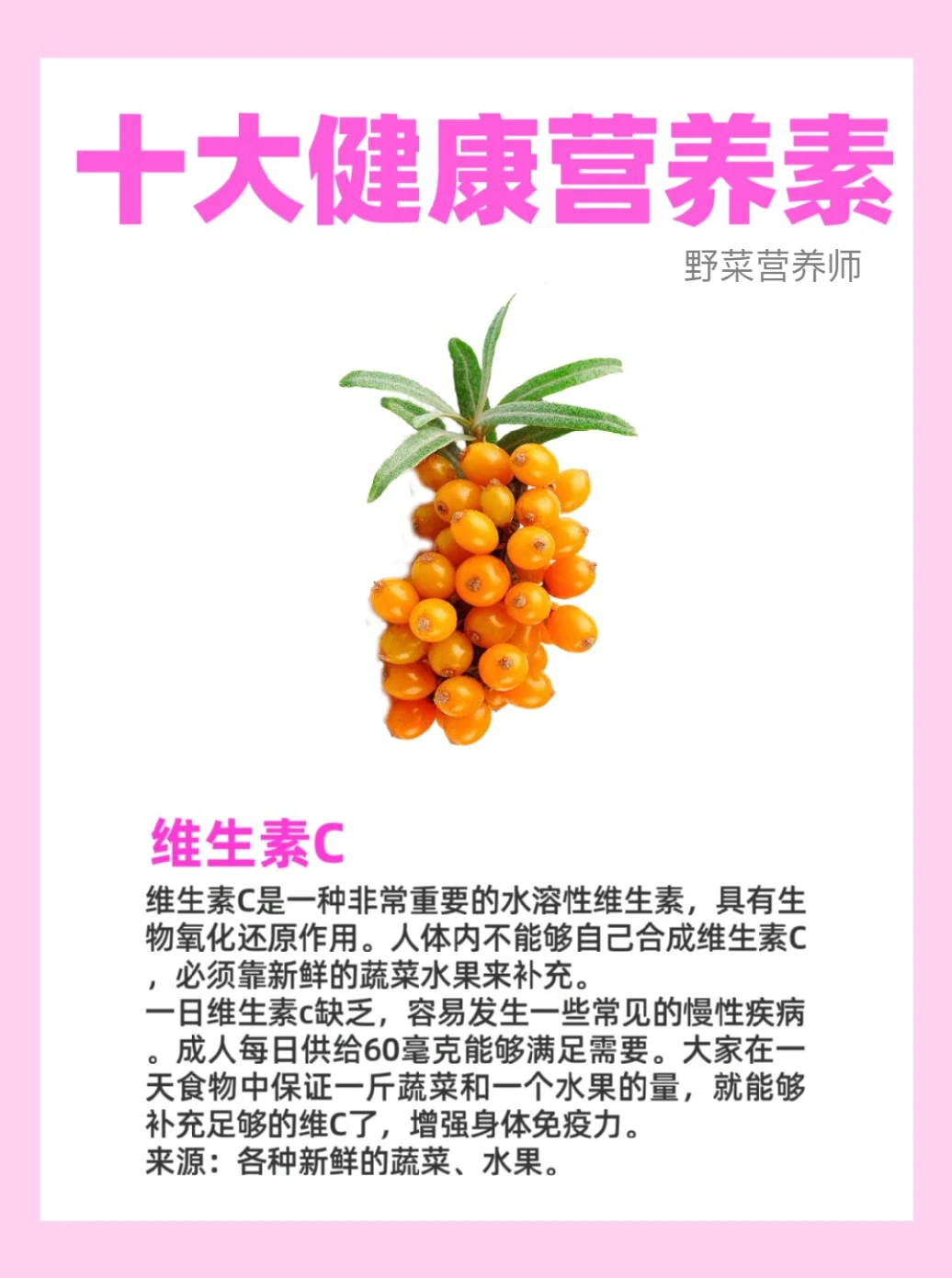 素C,必须靠新鲜的蔬菜水果来补充。一旦维生素C缺乏,容易发生一些常见的慢性疾病。成人每日供给 60毫克能够满足需要。大家在一天食物中保证一斤蔬菜和一个水果的量,就能够补充足够的维C了,增强身体免疫力。