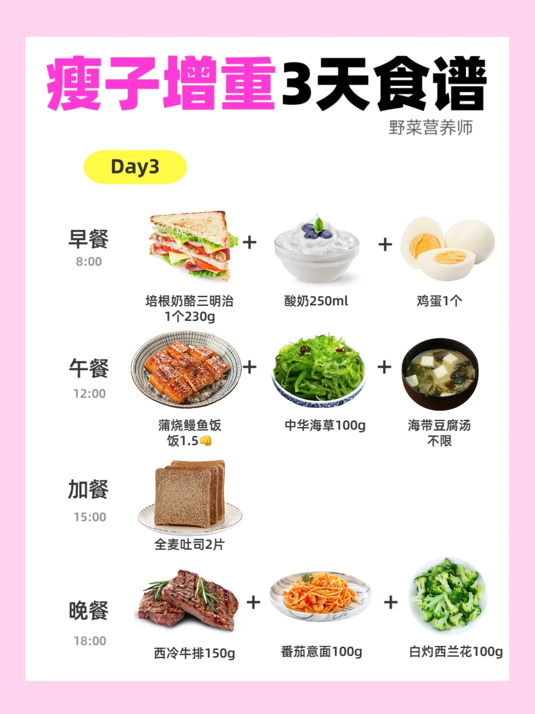 我给各位姐妹总结了适合瘦子增重的3天食谱