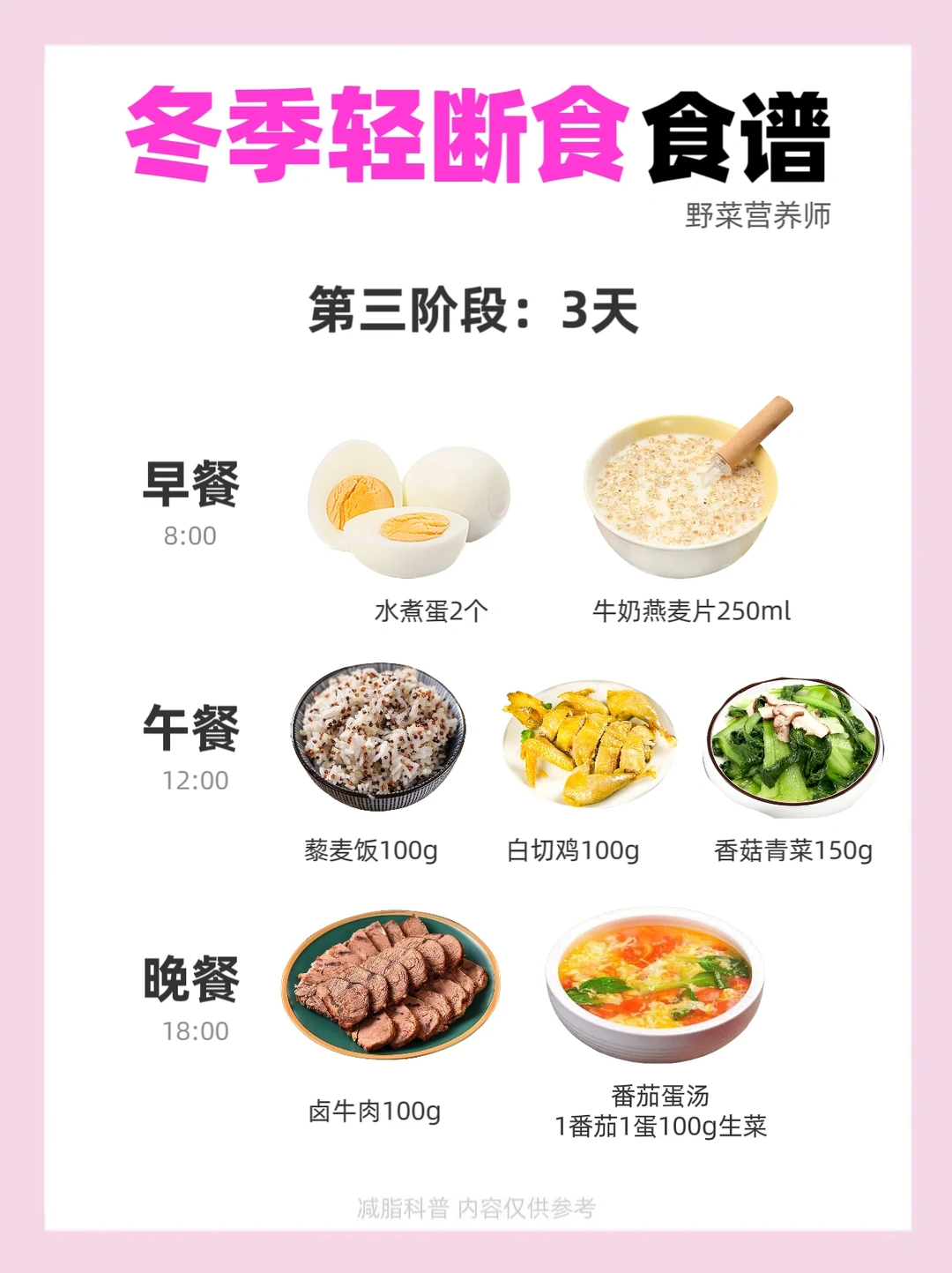 轻断食,又叫间歇性能量限制饮食,是按照一定规律在规定时期内禁食或给予有限能量摄入的一种饮食模式。这种饮食模式适合大小基数、平台期不掉秤的姐妹,野菜营养师给大家分享的这套自用轻断食食谱,不会过于苛刻,很好执行,自用下来也是掉秤蕞👍🏻的