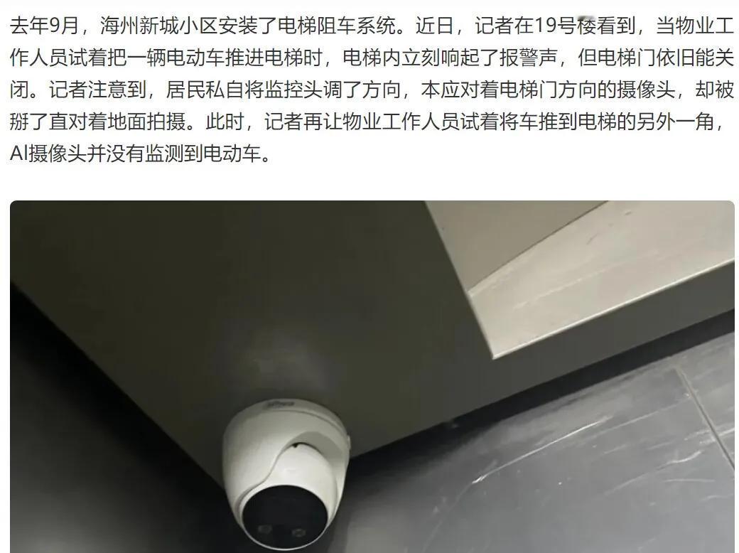 目前有些地方开始在电梯内安装智能Ai系统,当电动车进入时会自动报警并限制电梯运行。不过一些大聪明也有对策,包括:用雨衣遮挡车子,用摄像头方向扭偏,或者直接对摄像头喷漆。而且这种智能摄像头。不能阻止,一些人将电瓶车停在楼道口,同样存在着一个巨大的安全隐患。