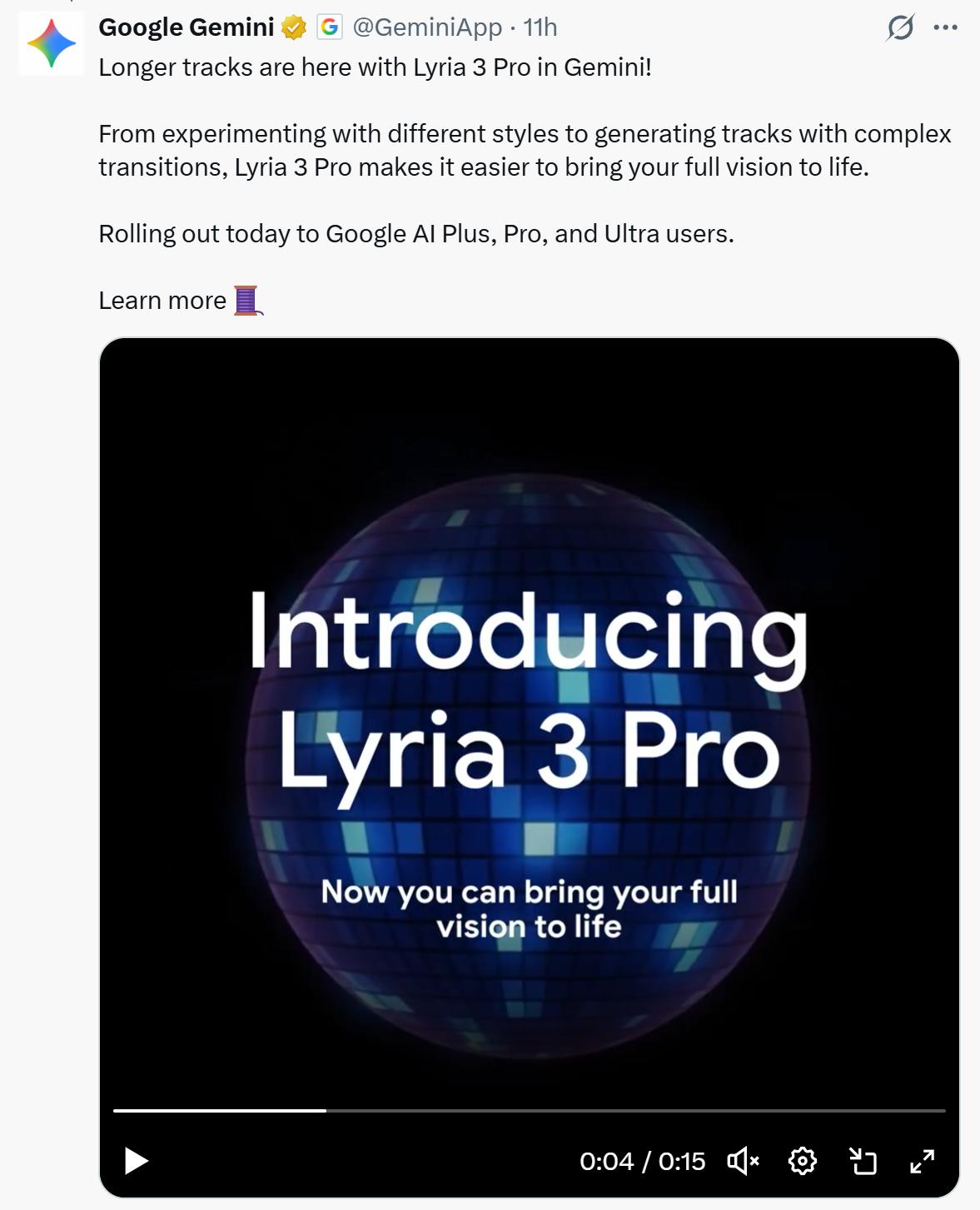 谷歌官宣新模型Lyria 3 Pro(图源:X)