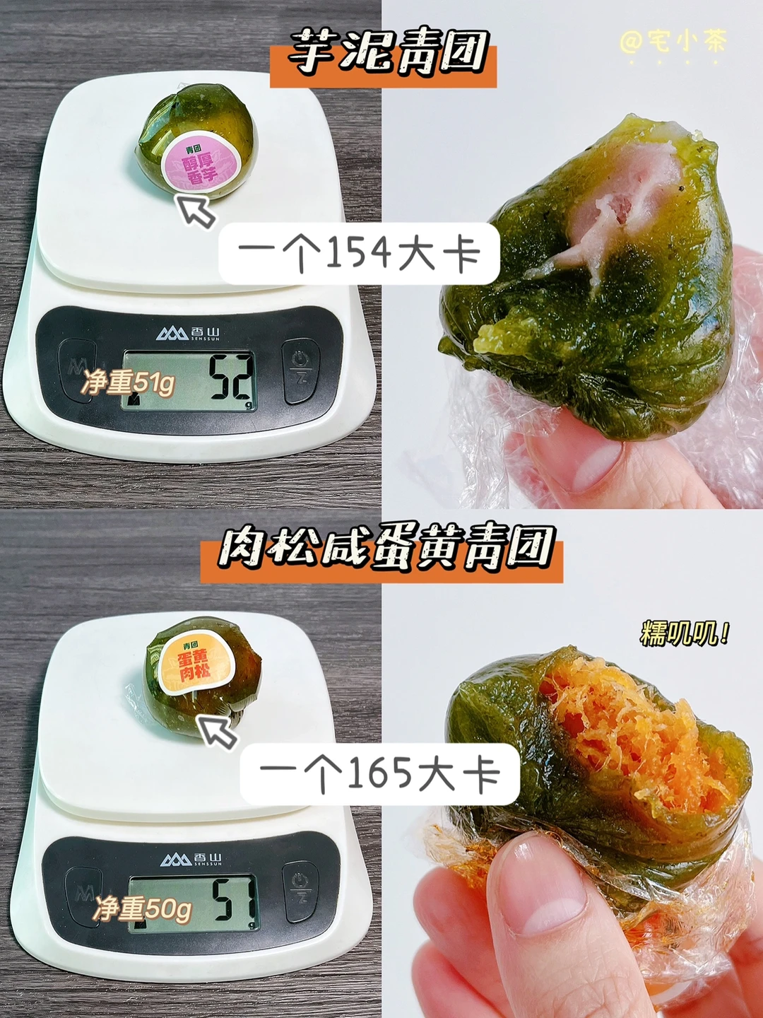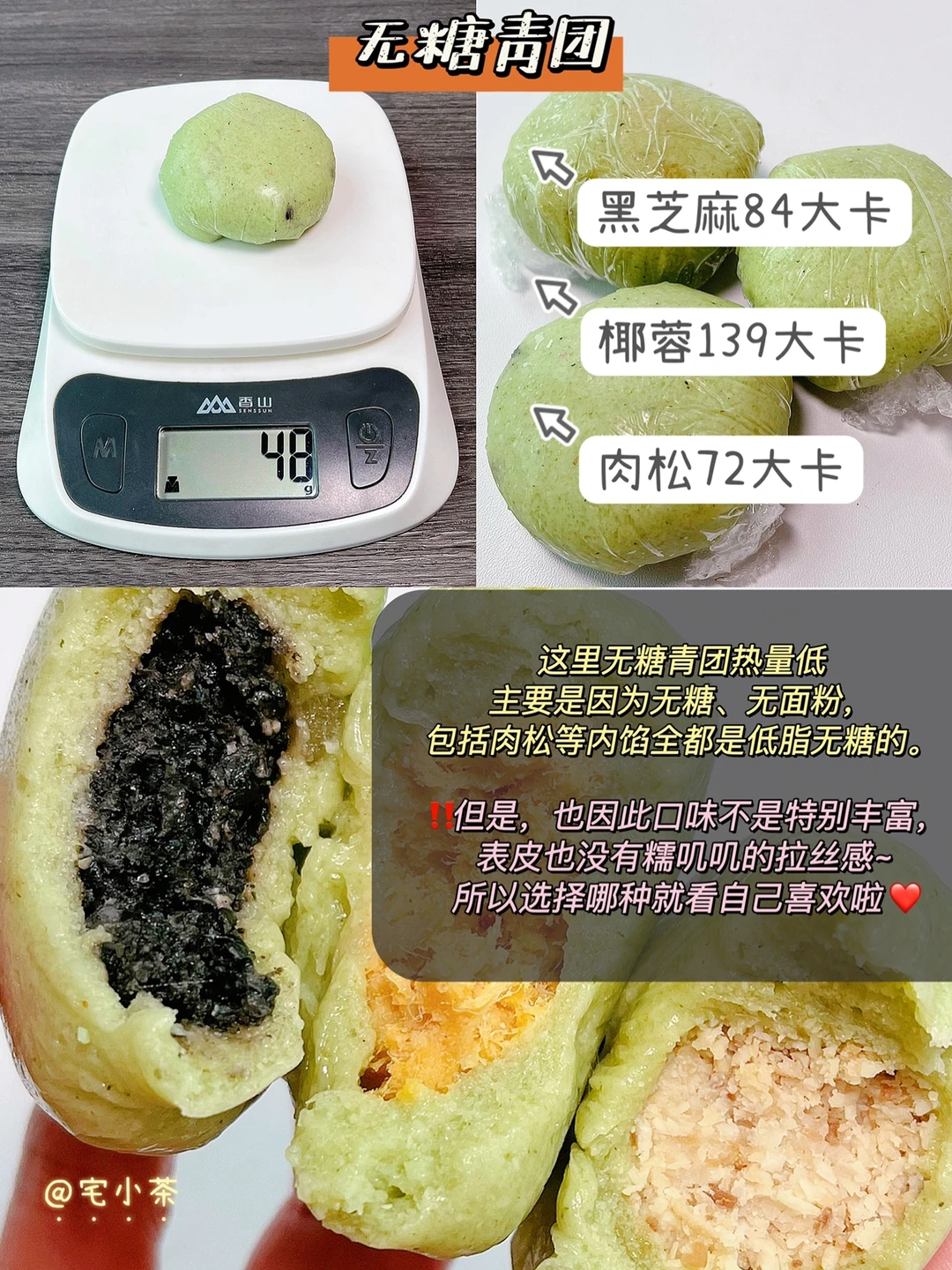 PS:无糖青团热量低的主要原因是无糖、无面粉,包括肉松等内馅全都是低脂无糖的。