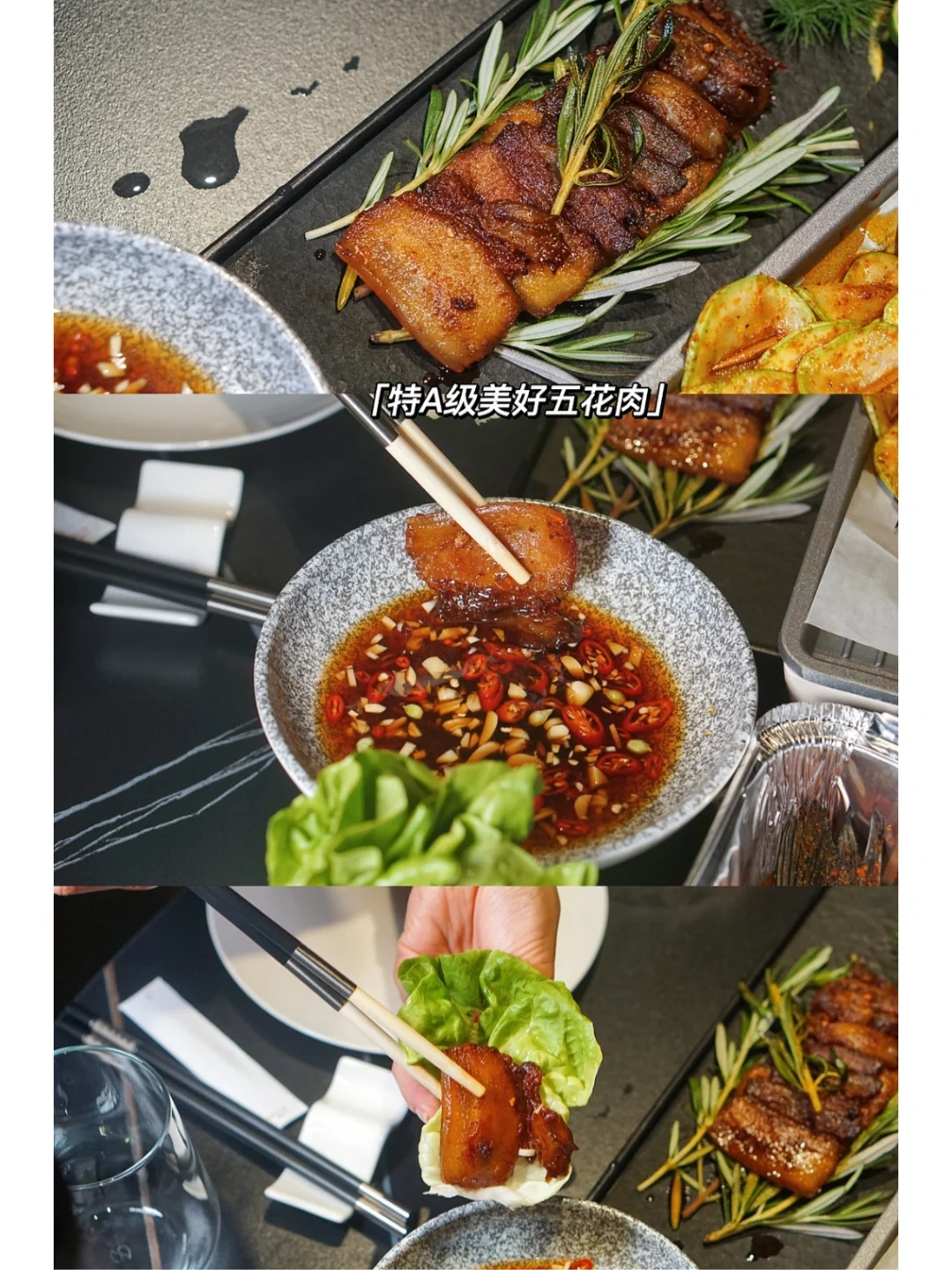 🥩超A级美好五花:很特色的一道菜,五花肉肉质很棒,蘸了特色蘸料以后用生菜裹着吃,又香又脆还不腻。