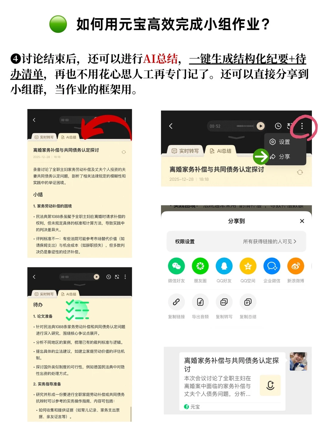 ④讨论结束后,还能进行AI总结,一键生成结构化纪要+待办清单,再也不用花心思+人工专门记了。分享到小组群就能当作业框架,谁该做啥一目了然,分工推进超顺畅