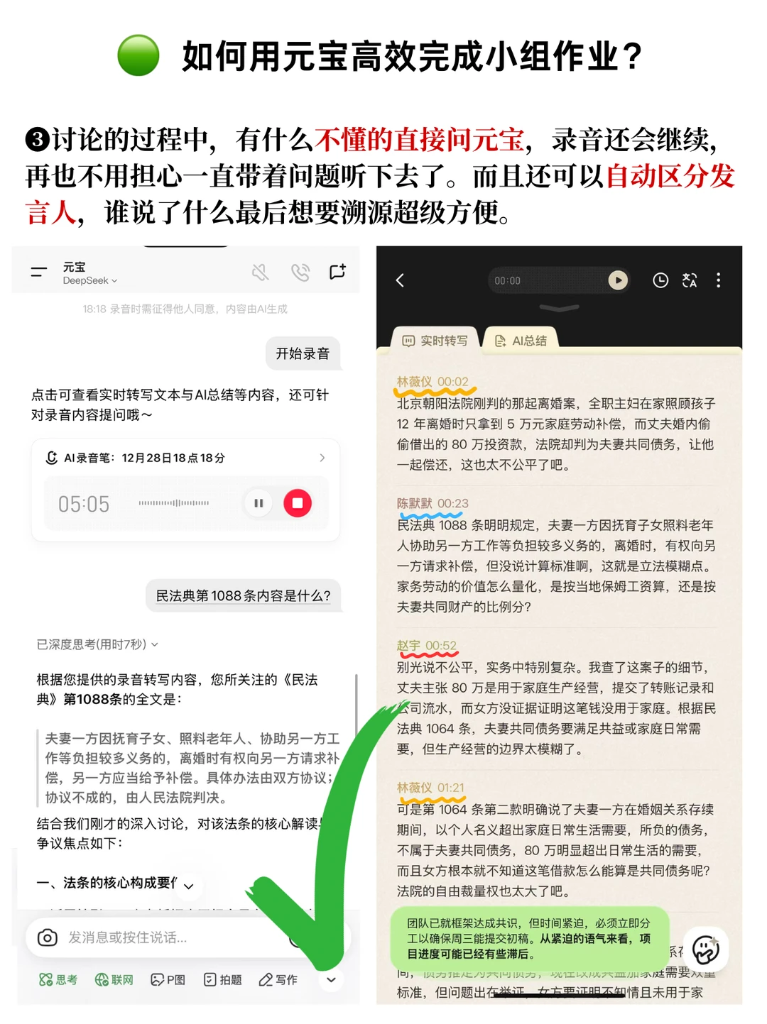 ③讨论的过程中,有什么不懂的直接问元宝,录音还不中断,再也不用担心一直带着问题听下去了~而且还可以自动区分发言人,后续想找是谁提的观点,不用翻半天记录