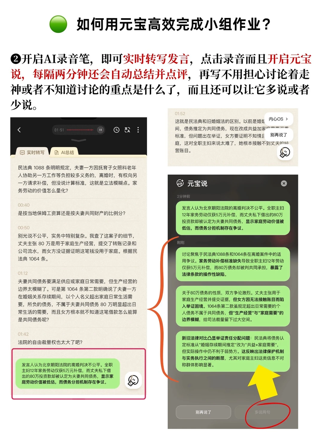 每次做小组作业真的很头大!无论是案例研讨还是专业术语,不仅记不过来,看法不一样还容易吵来吵去;会后想整理纪要还总漏关键点,想追溯是谁提的更是大海捞针,我的解决方案是:手机+元宝的AI录音笔