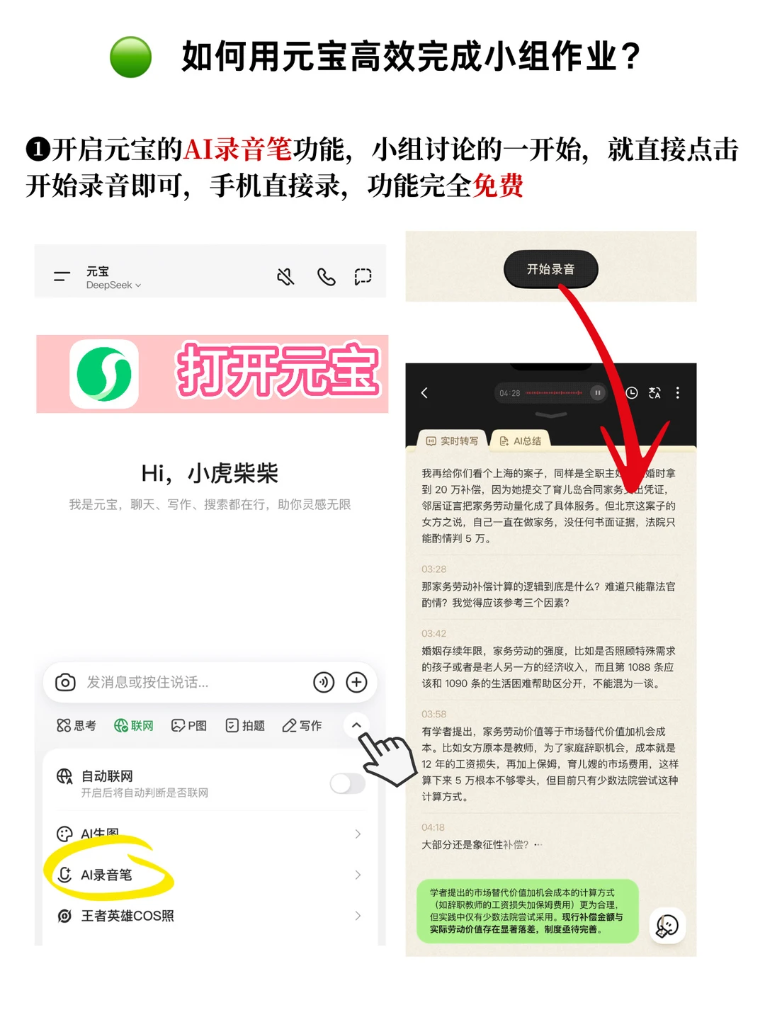 用元宝的AI录音笔功能,能一键搞定小组讨论、形成结构化纪要+待办清单