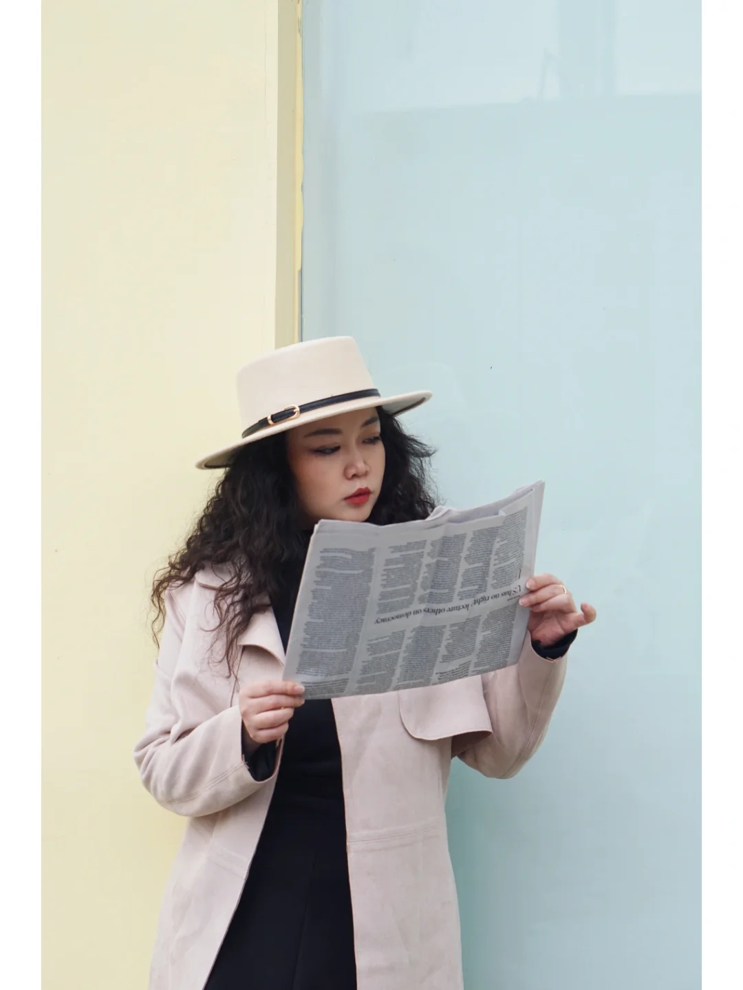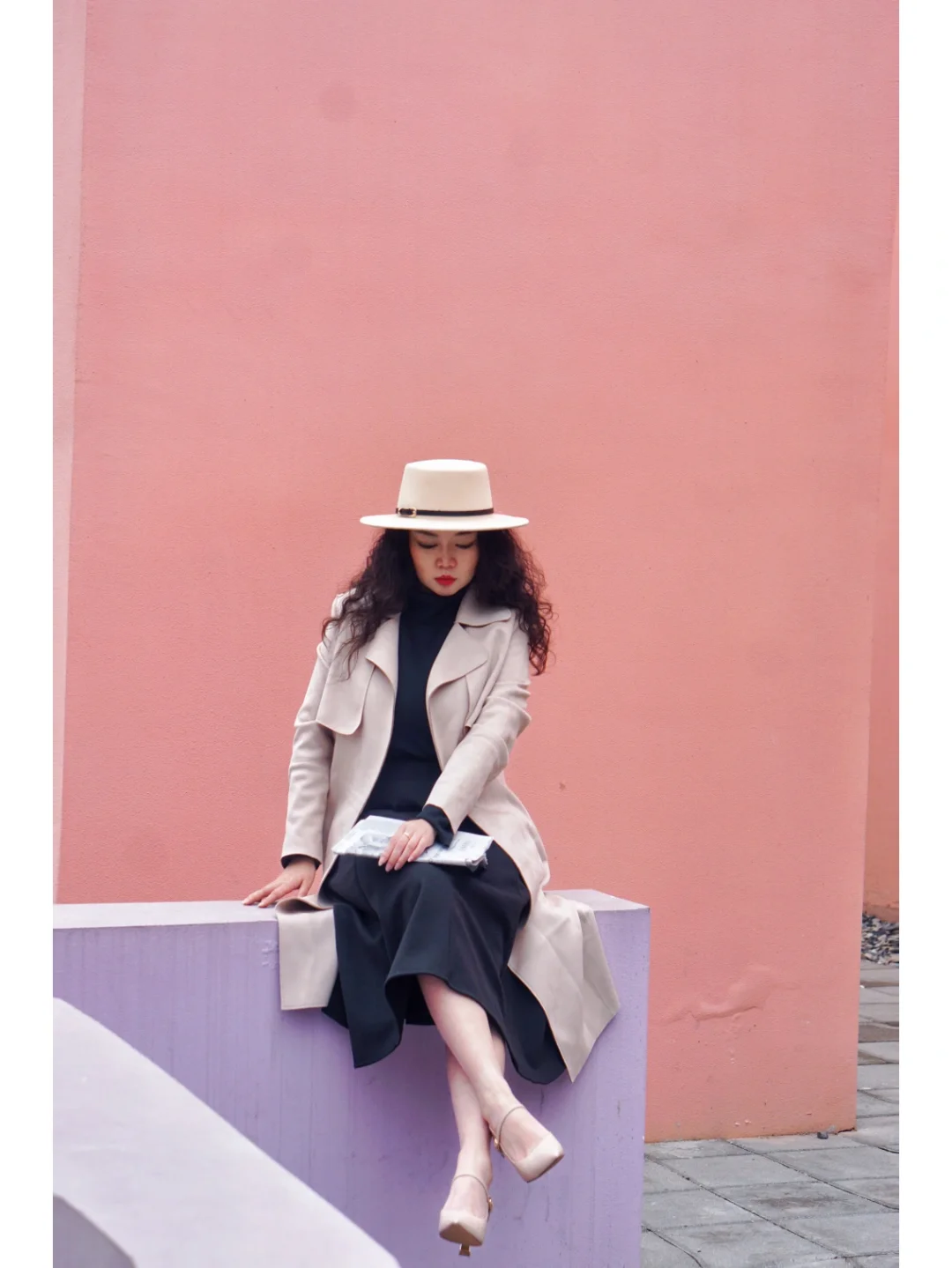 👒帽子:宽檐平顶帽,复古而优雅。