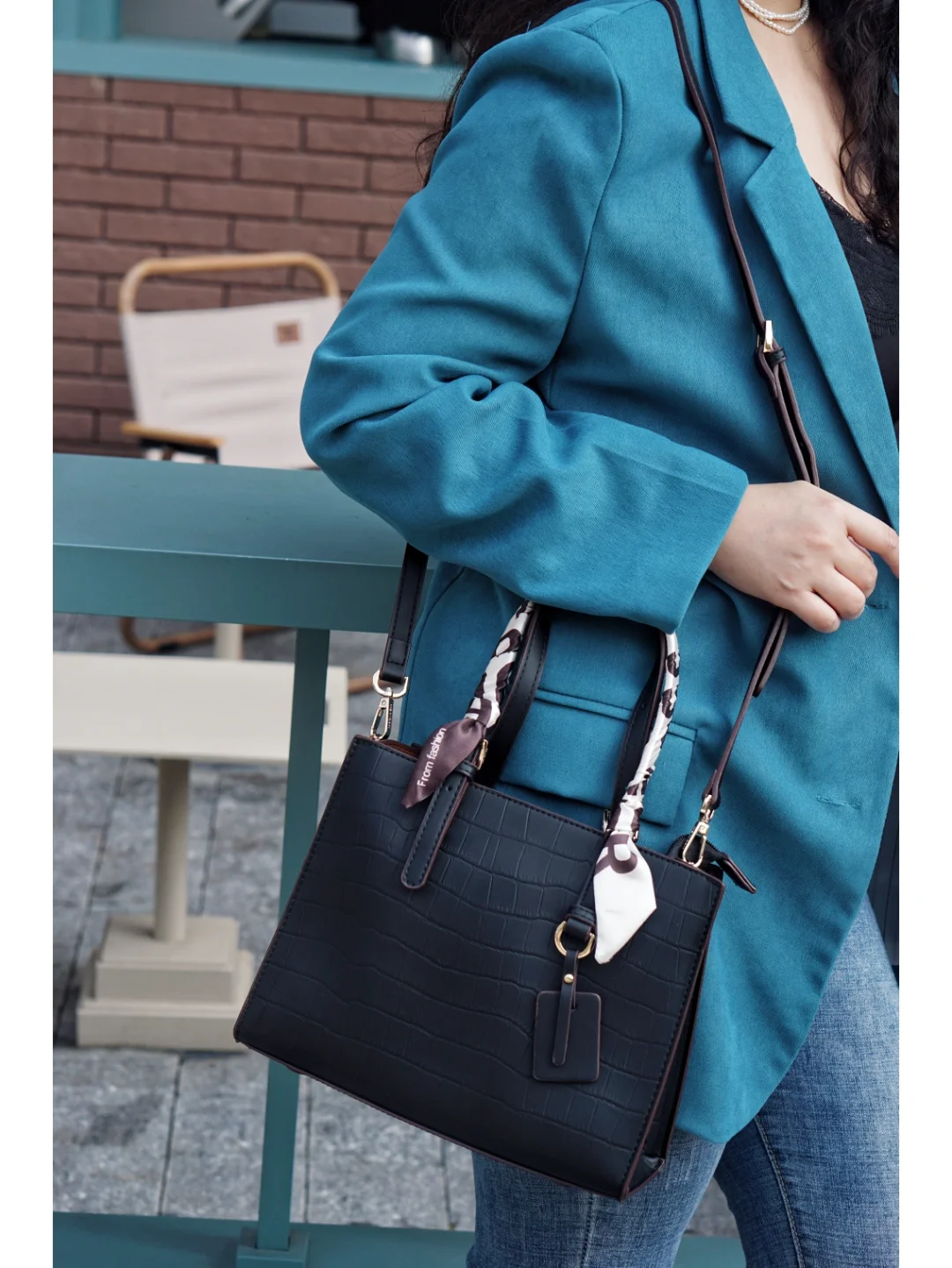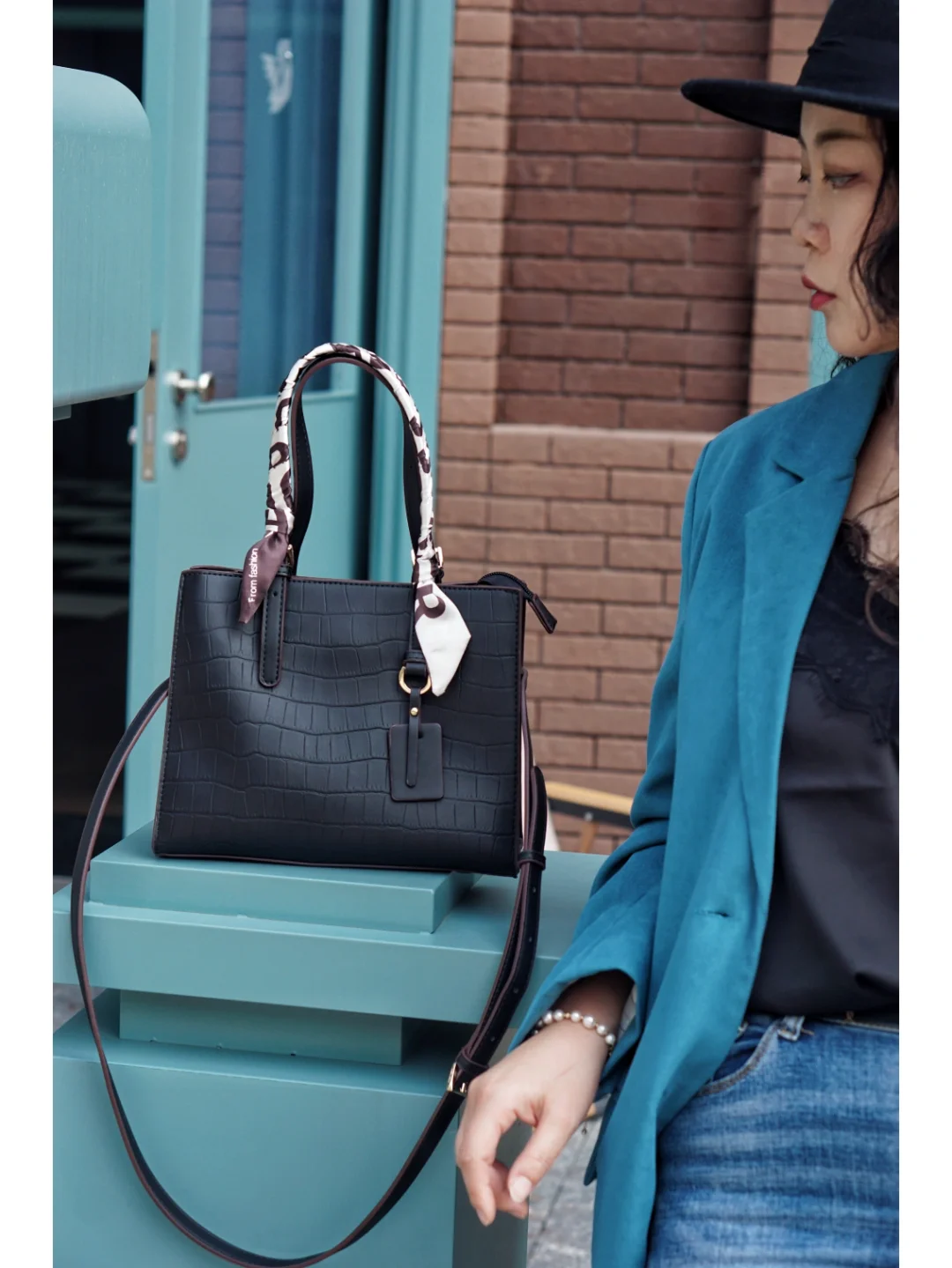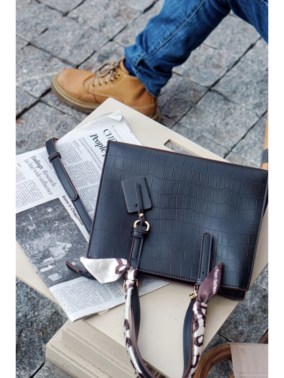 👜包:稻草人,黑色鳄鱼纹的手提包是四季百搭单品,丝巾点缀增添了几分女人味,材质柔软还很轻,除了手提,还可以单肩和斜挎背,实用性很强;