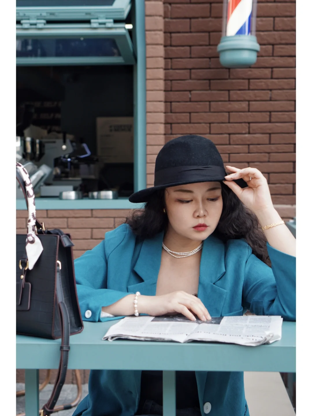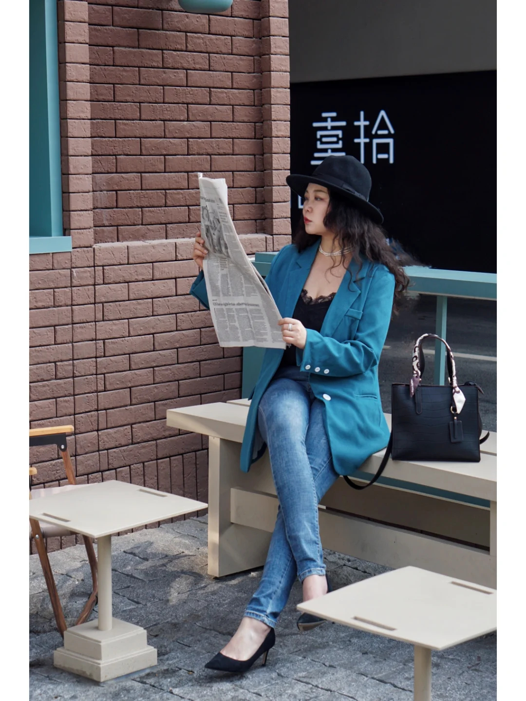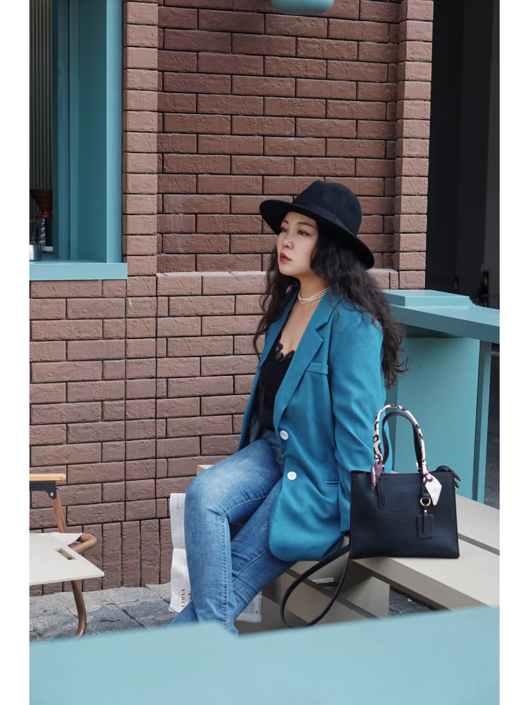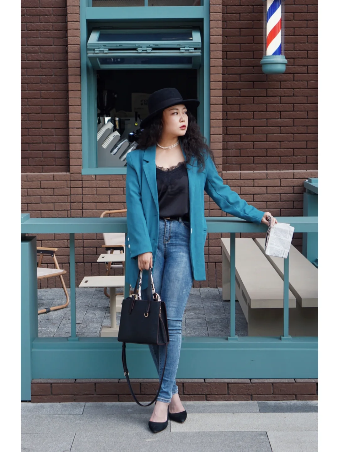 🥼衣服:湖蓝色西服配牛仔裤,小休闲适合日常穿,黑色的蕾丝吊带内搭是人手一件的必备品;