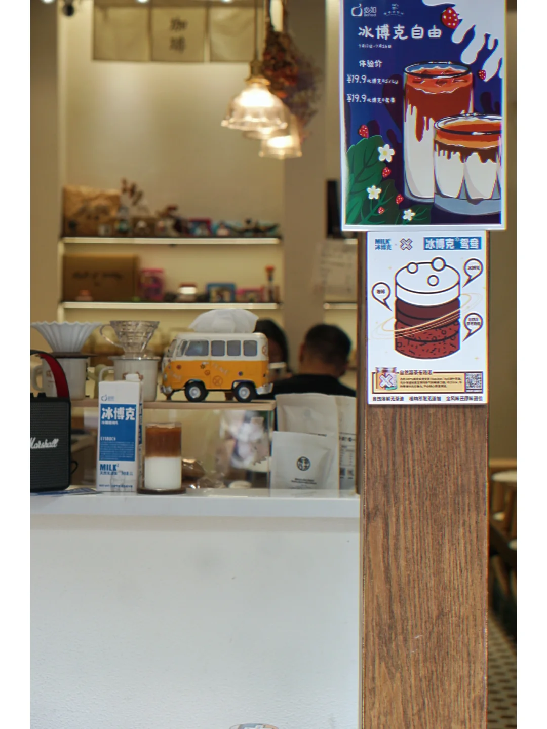 这是贴在门口的新品推荐, 那就尝尝鲜吧,口味独特,咖啡和茶的搭配蛮新奇,咖啡混合茶,两种口味都有,却不互抢,再加入冰博客牛奶,味道我是喜欢的。 口感很醇香有一股淡淡的海盐芝士味,但是又有茶味和咖啡苦涩的香气,说实话我从来没有喝过这样的咖啡,体验感100分!