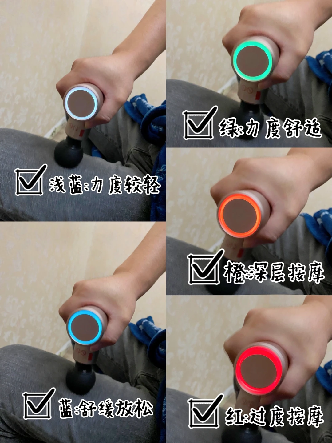 ✅智能灯圈设计,真的太贴心了!按摩时五个灯圈颜色会提醒你力度轻重,蓝绿色按摩斜方肌,橙色按摩肌肉腿,红色就是力度太大要松开。操作简单,实时提醒保护肌肉。