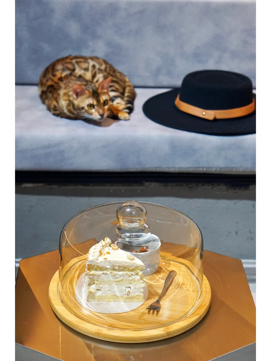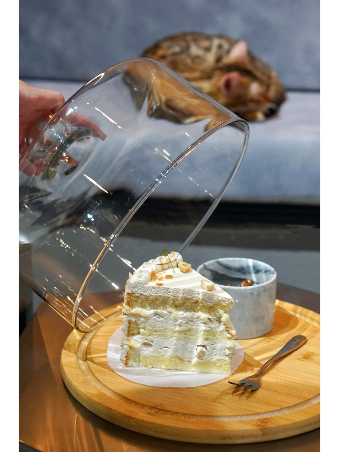 ②套餐里面包含了一杯饮品🥤一份法式甜品🍰,被甜品惊艳了,没想到猫咖也可以有这么好吃的法甜,甜而不腻口感细腻,蛋糕切片分量真是实在,超大一块[笑哭R],饮品挑选了焦糖玛奇朵,口感也是极好的;