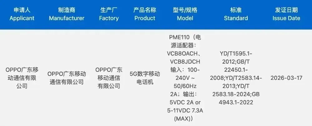 除此之外,一款型号为PME110的OPPO旗下新机在最近通过了认证。