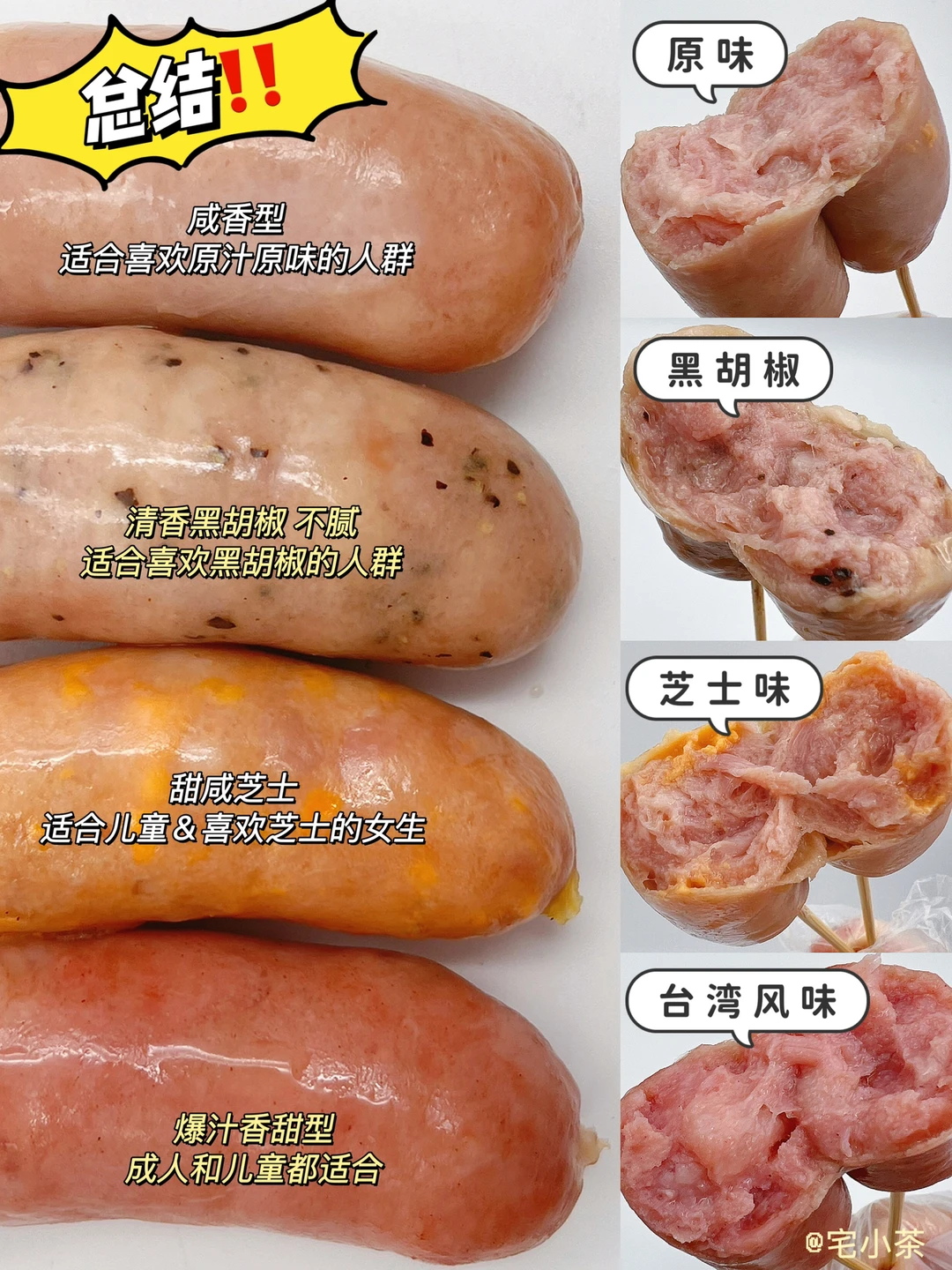 👉🏻总的来说,喜旺这四种烤肠都很有自己的特色,家里有宝宝或者喜欢甜口烤肠的,可以选台湾风味and芝士味,黑胡椒味适合喜欢清新感的~原味烤肠就是原汁原味爆汁感啦!
