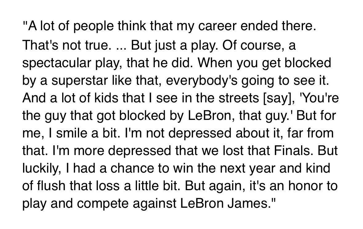 今晚赛前,开拓者队主教练蒂亚戈·斯普利特回忆了13年前勒布朗·詹姆斯对他的盖帽,那是在2013年NBA总决赛中,詹姆斯封盖了斯普利特的扣篮尝试。(我们上个月在勒布朗职业生涯经典照片合集中收录了这一幕)网页链接(这个里面)nba詹姆斯nba经典回顾