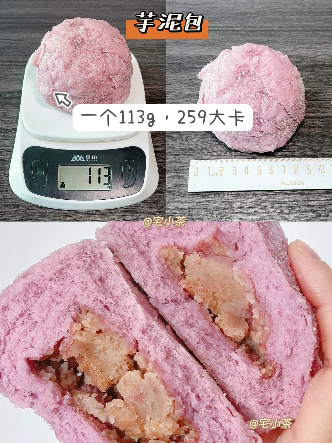 芋泥包:一个113g,259大卡