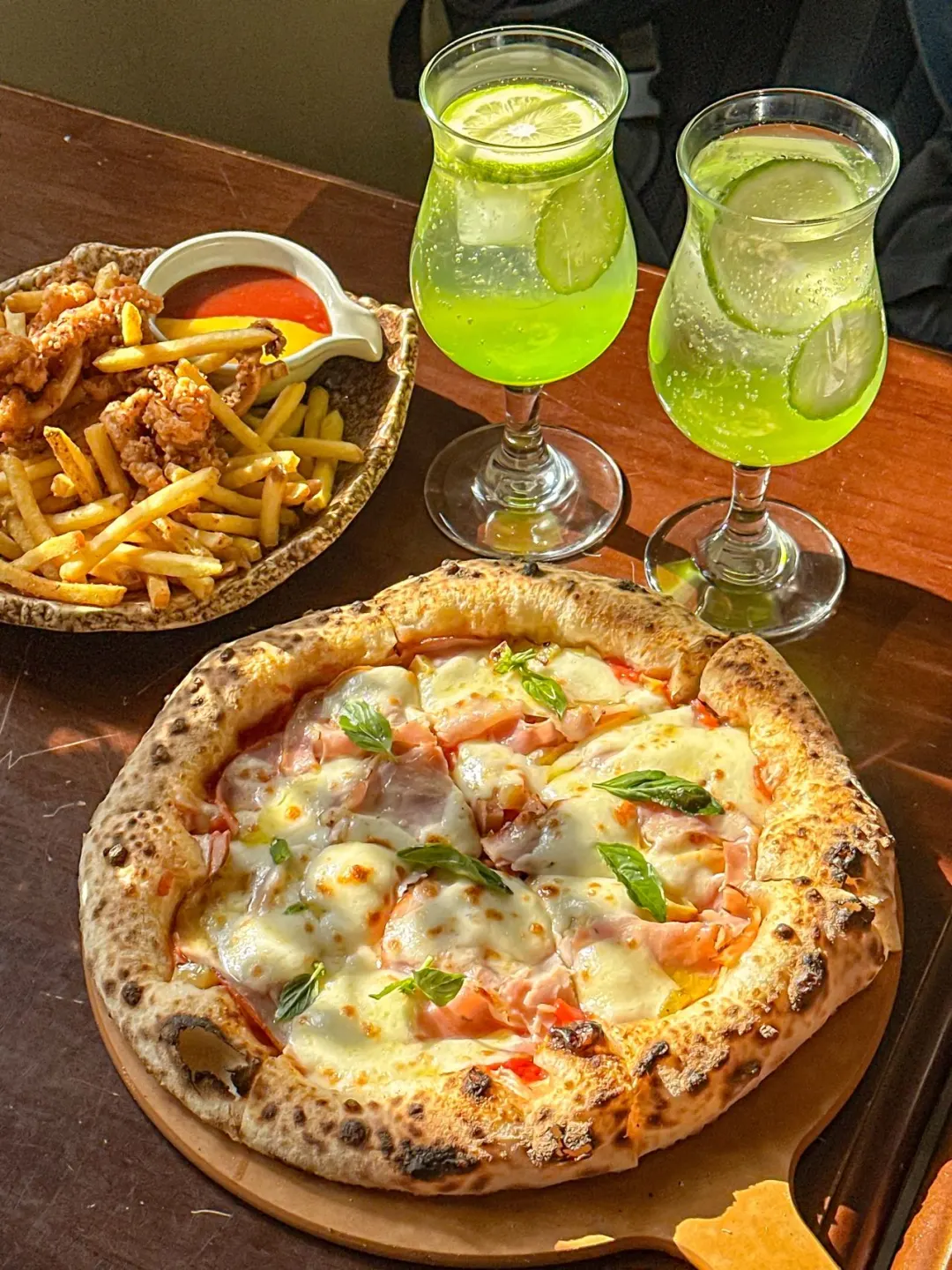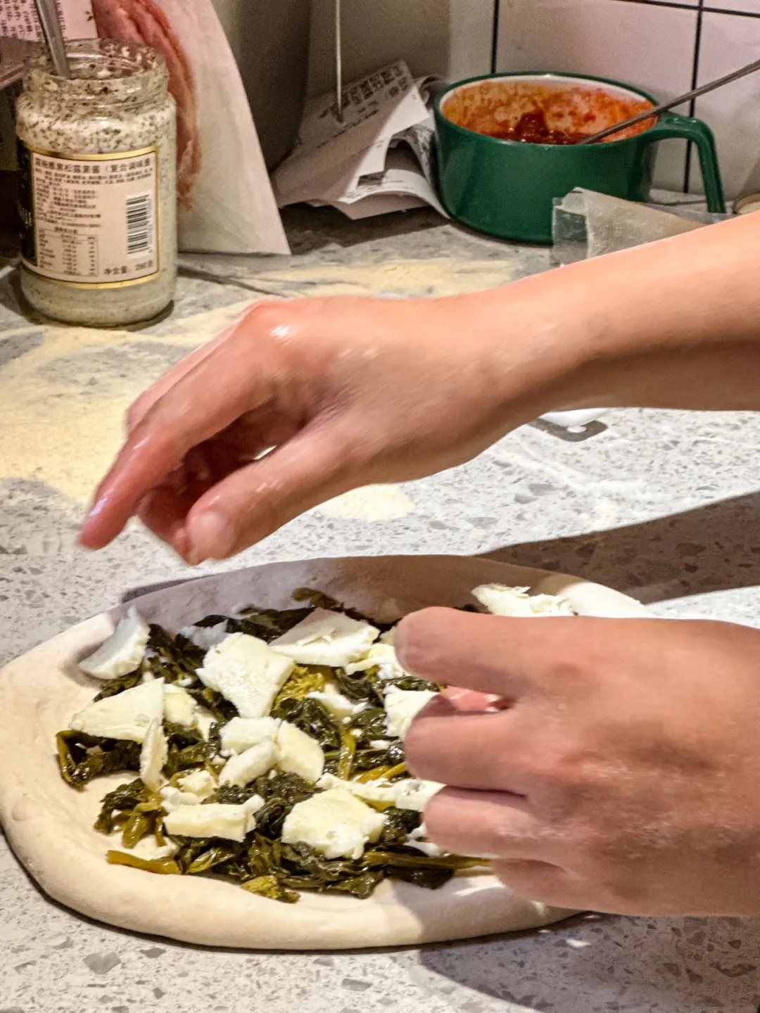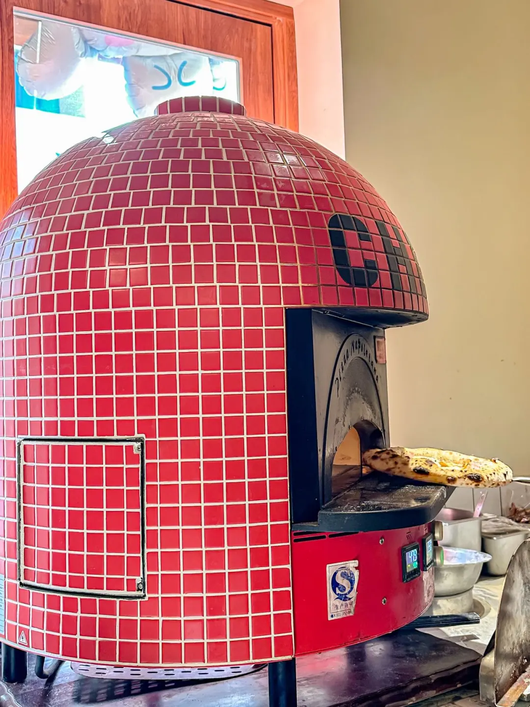 一进门就看到了红色的窑炉,点完披萨开始手工制作、烤制,薄薄的饼底加了很多料,肉、菜、奶酪…一口下去口感超级丰富