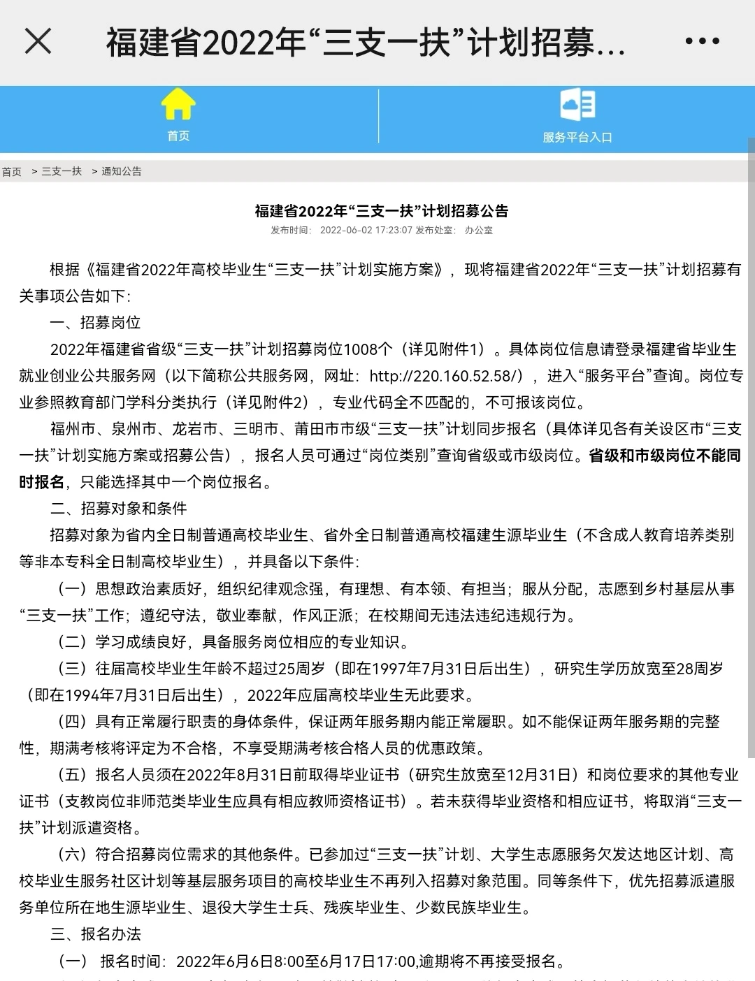 福建三支一扶公告发布!招录1008人!报名时间:6月6日8:00至6月17日17:00