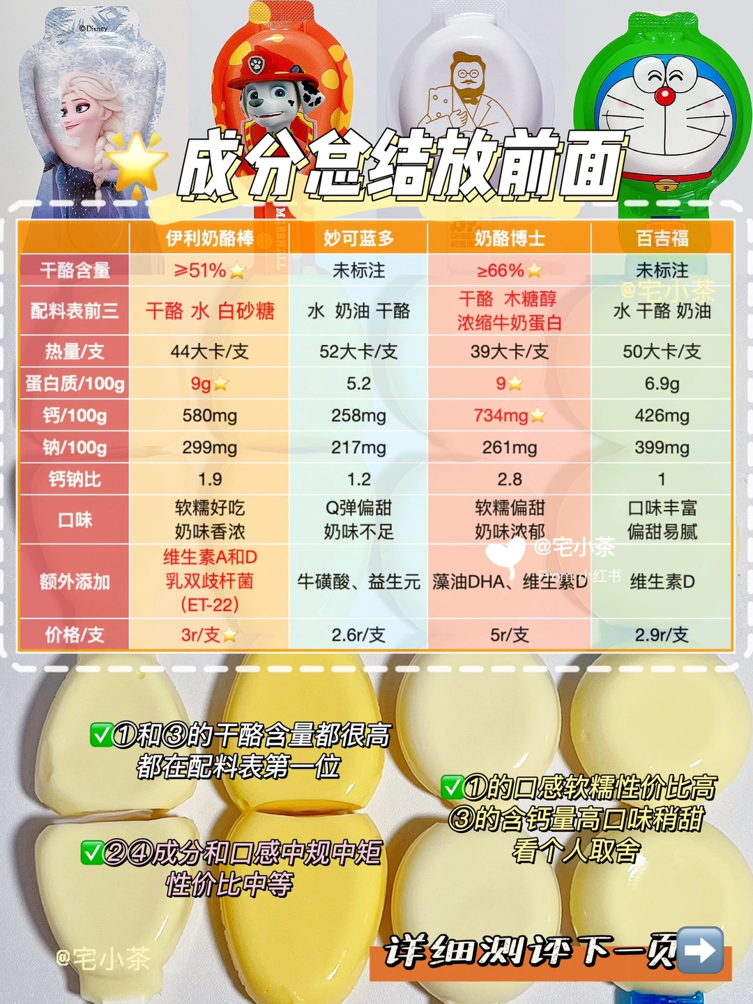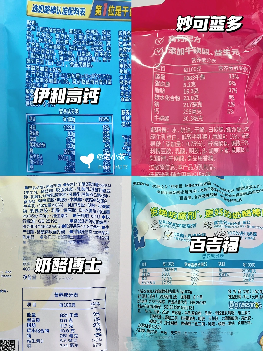 ①和③的干酪含量都很高,而且都在配料表第一位,蛋白质含量也有9g/100g。