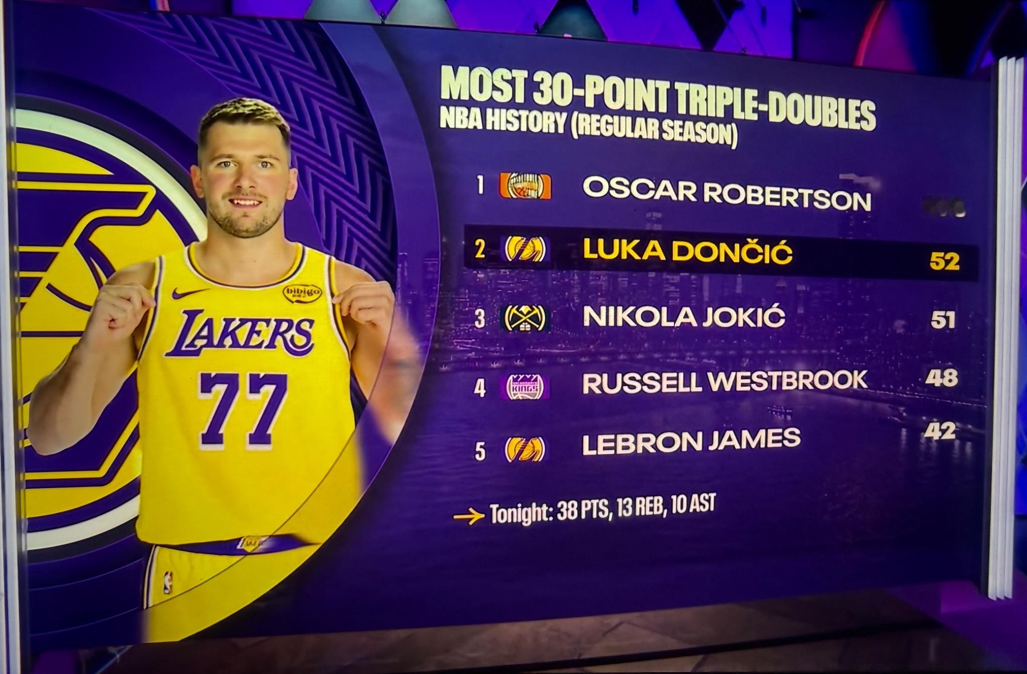 据湖人队消息:卢卡·东契奇今晚在丹佛拿下38分、13篮板和10助攻的三双数据。这是他本赛季第五次三双,也是职业生涯第87次三双。据湖人队消息:这也是东契奇本赛季第四次砍下30+分三双,成为湖人队历史上仅有的球员之一,与勒布朗·詹姆斯和魔术师约翰逊并列,他们是队史中单赛季至少有四场此类比赛的球员之一。这场比赛标志着他职业生涯第52次30分三双。湖人vs掘金东契奇38分三双湖人战胜掘金