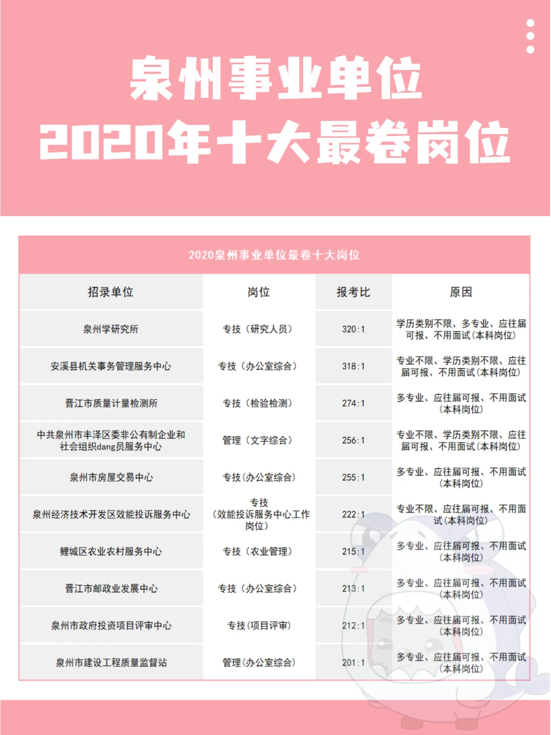 往年泉州报名zui卷十大岗位见上图,泉州事业单位如果公告出了会通知大家哦~