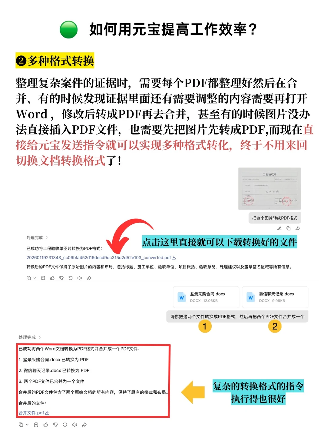 ②多种格式转换:整理复杂案件的证据时,需要每个PDF都整理好然后合并、发现证据里还有要调整的又要再打开Word...现在直接给元宝发送指令,直接就可以实现多种格式转化,终于不用来回切换文档了!