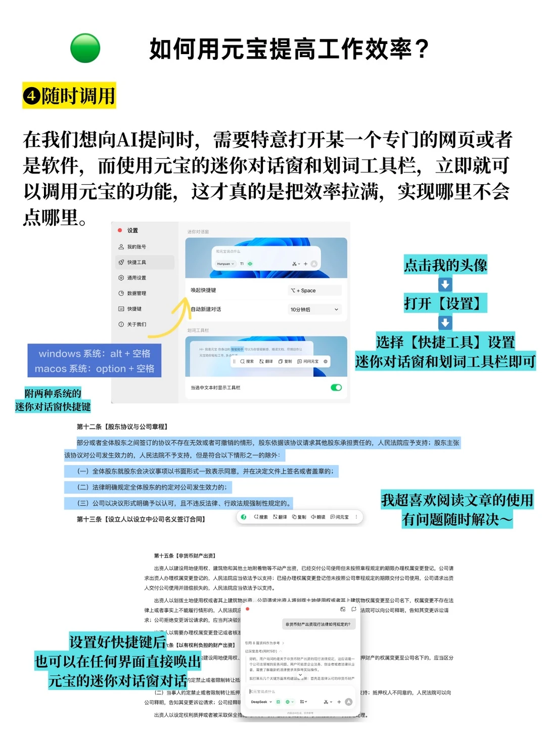 ④随时调用:很多时候我们要用某个工具,总要特意打开某个专门网or软件,而用元宝的迷你对话窗和划词工具栏,立即就可以调用元宝的功能,这才真的是把效率拉满,实现哪里不会点哪里