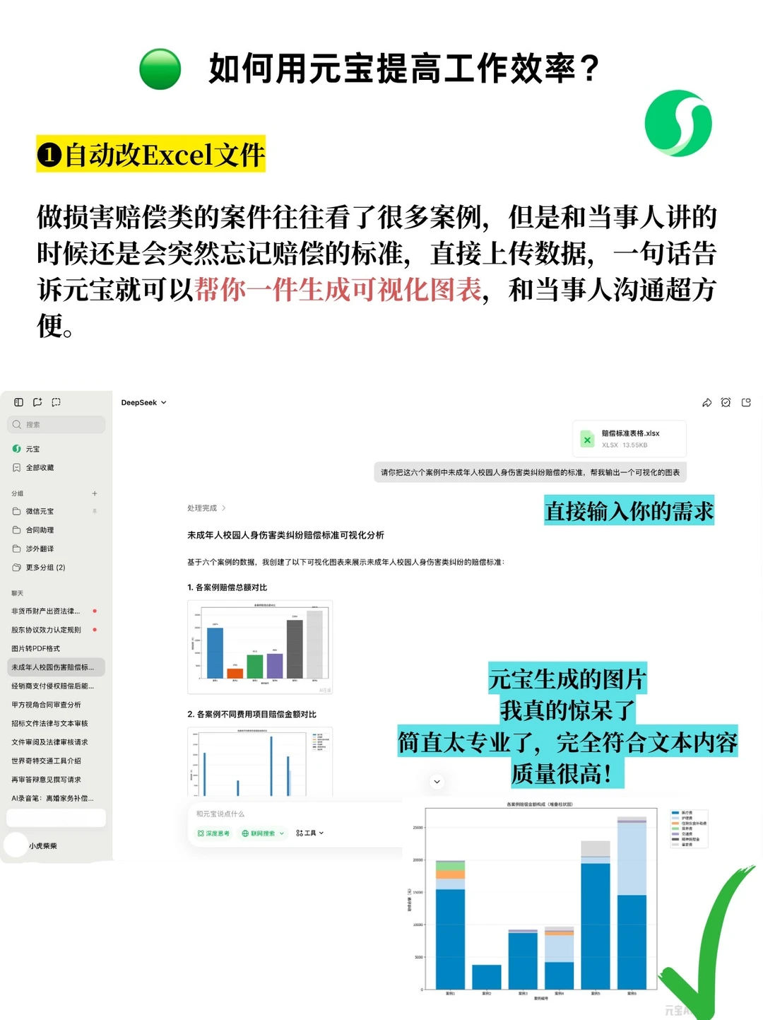 ①自动改Excel:做损害赔偿类的案件往往看了很多案例,但是和当事人讲的时候还是会突然忘记赔偿的标准,直接上传数据,一句话告诉元宝就可以帮你一件生成可视化图表,和当事人沟通超方便