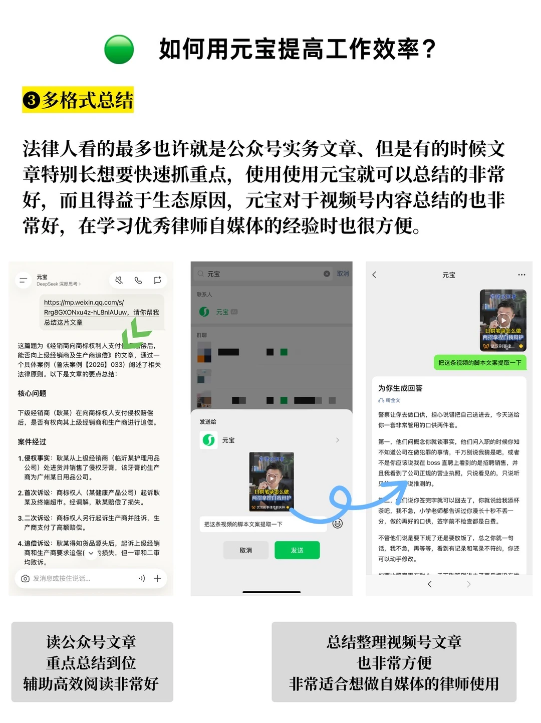 ③多形式总结:很多公众号实务文章特别长想快速抓重点,使用元宝能总结的非常好,而且得益于生态打通,元宝对于视频号内容总结的也非常好,在学习优秀律师自媒体的经验时也很方便