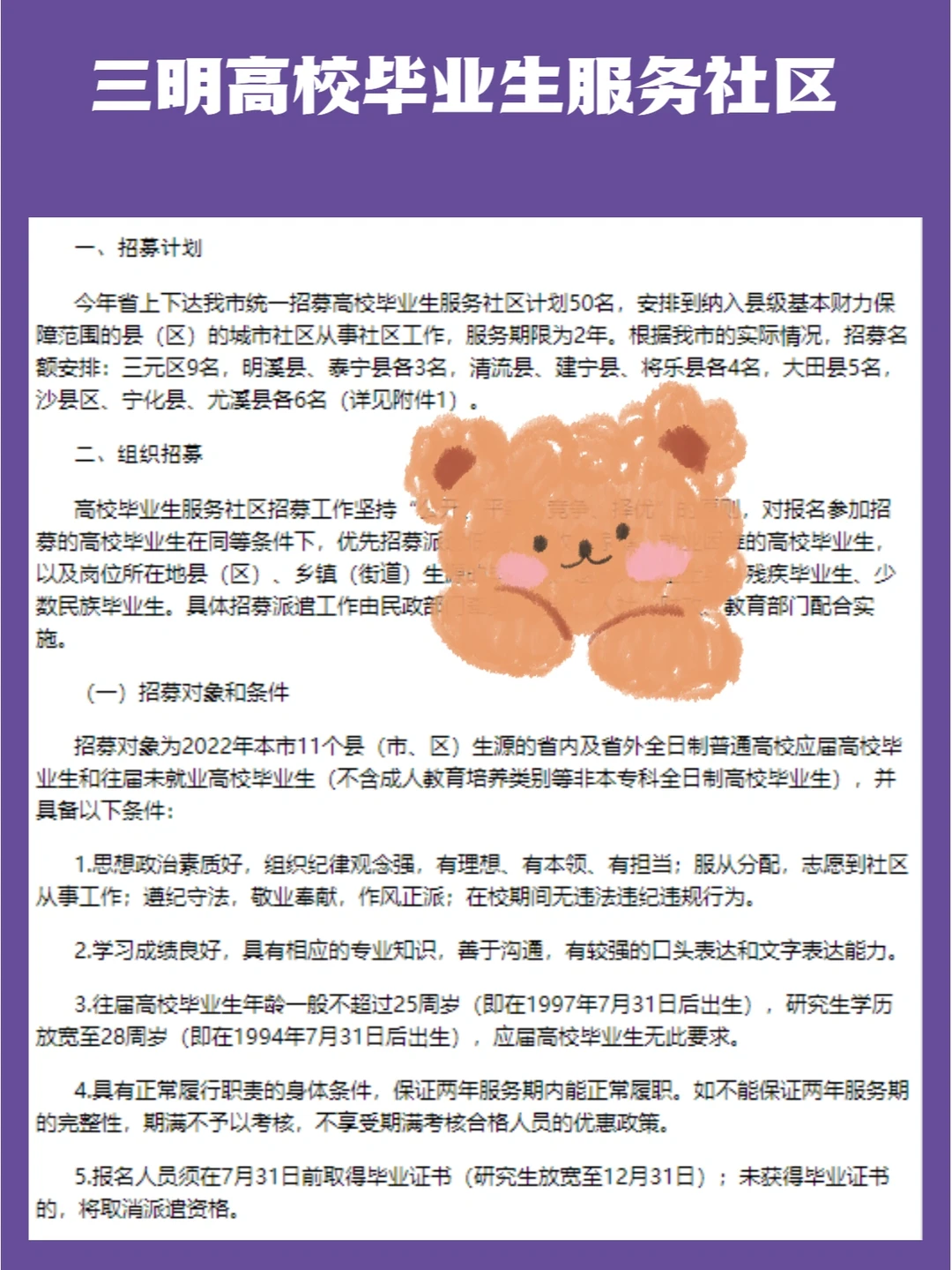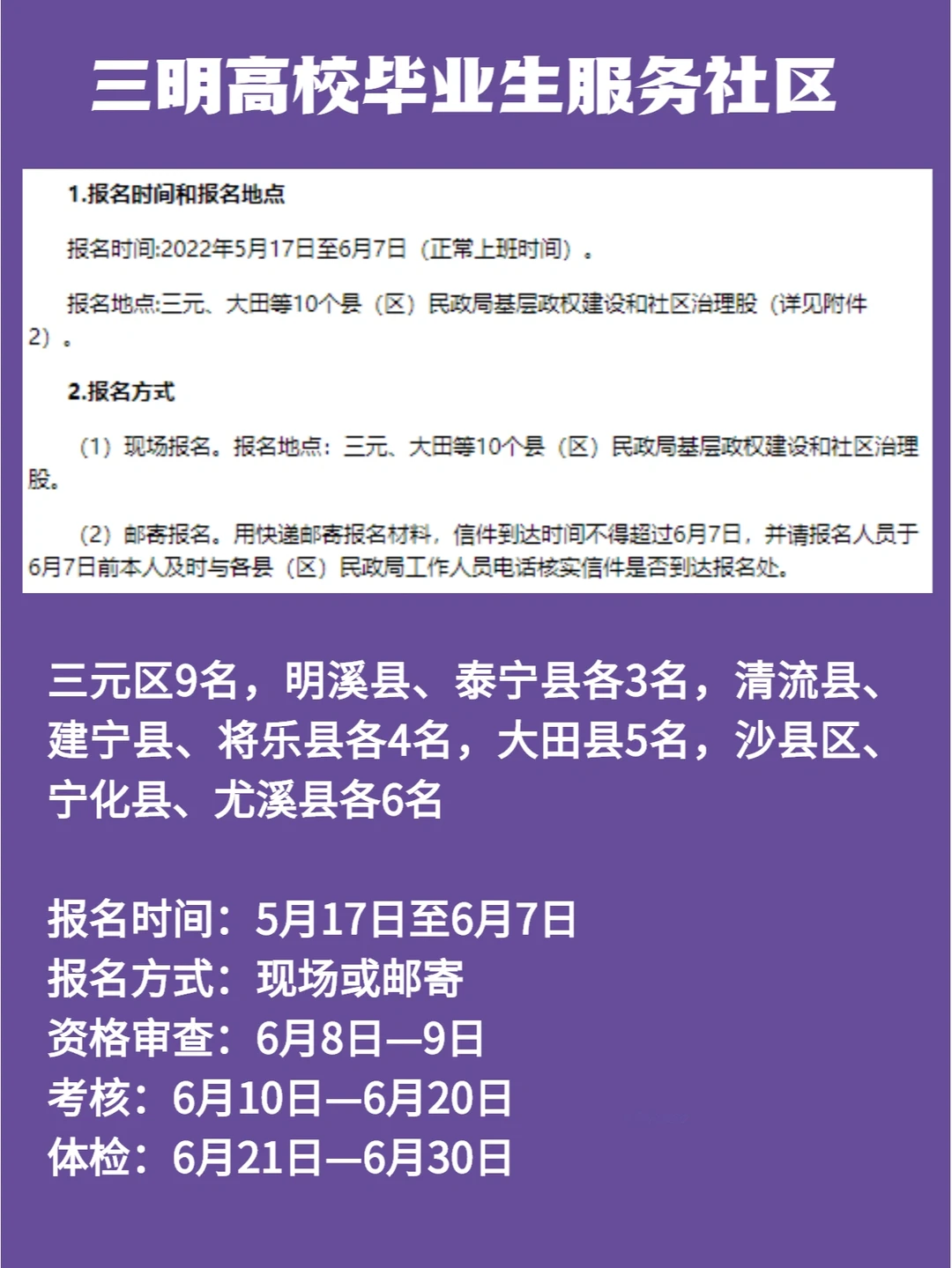 三明高校毕业生服务社区公告及报名入口已出!🌟三元区9名,明溪县、泰宁县各3名,清流县、建宁县、将乐县各4名,大田县5名,沙县区、宁化县、尤溪县各6名
