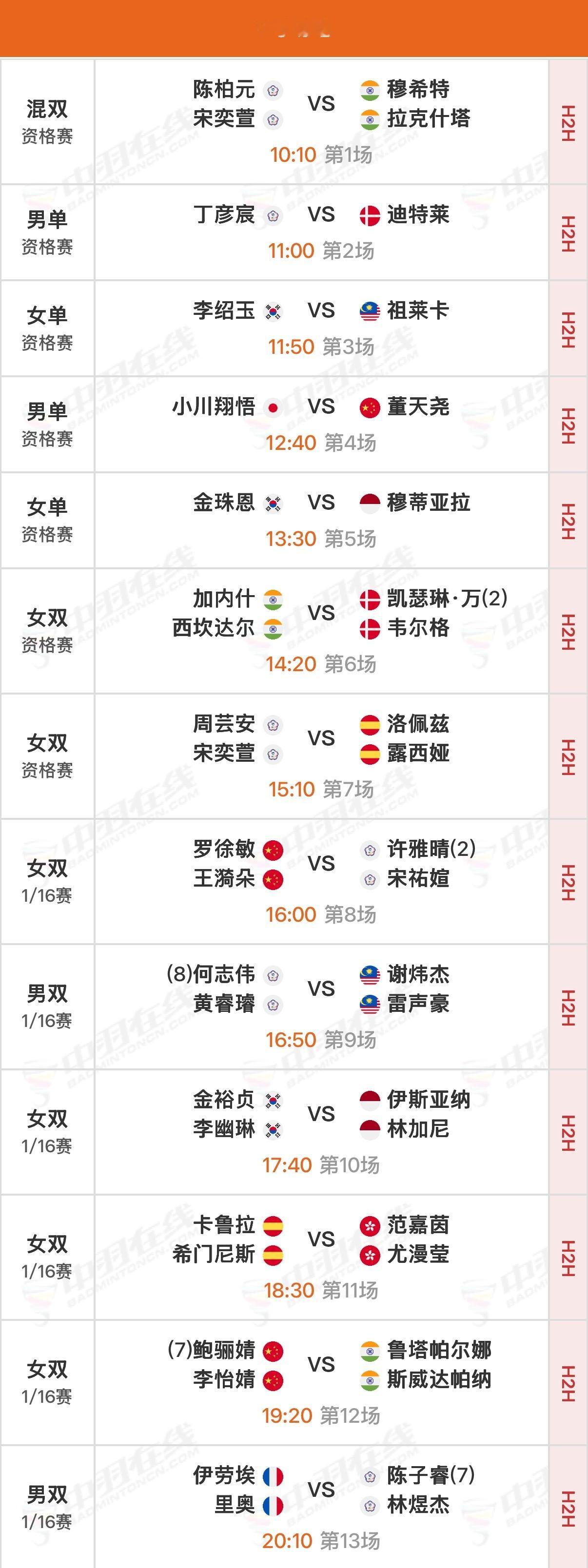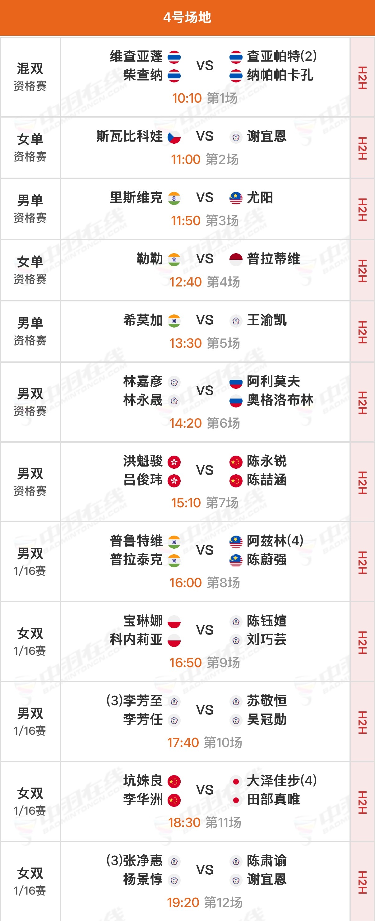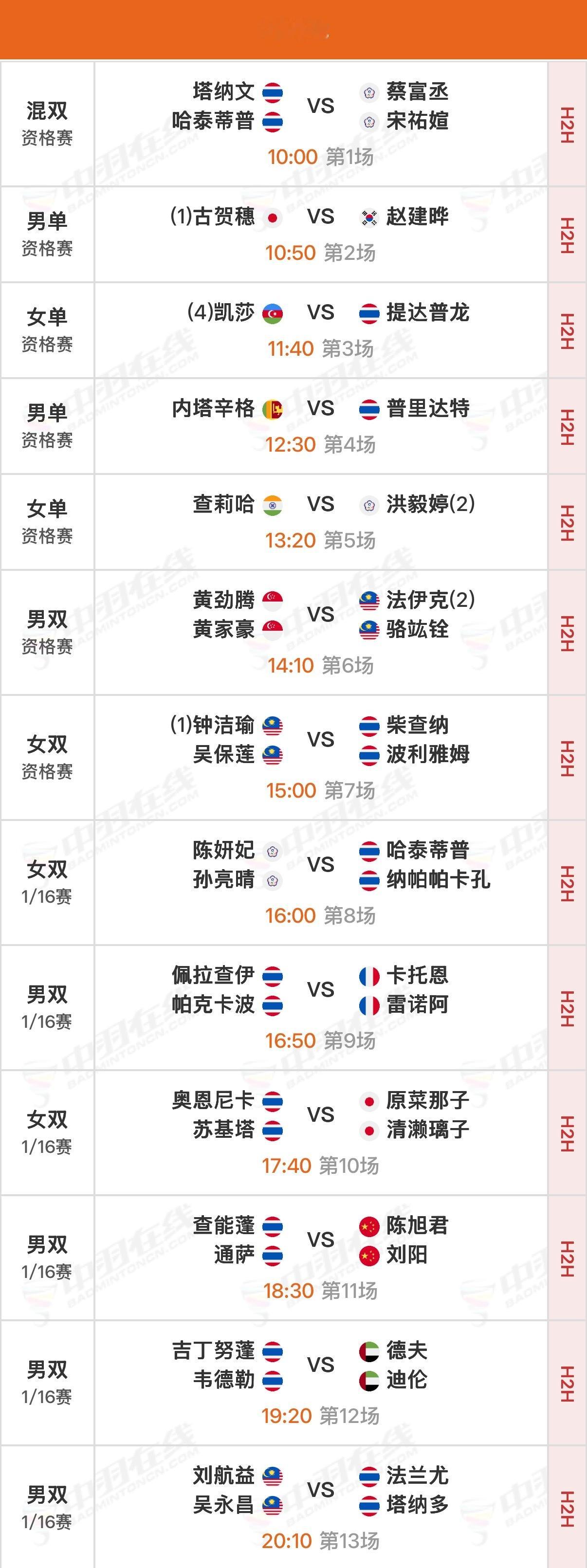 2026年泰国羽毛球大师赛 首日赛程资格赛10:00开始,正赛16:00开始,可在羽协公众号/视频号、优酷观赛实时比分:网页链接官方赛程:网页链接【一号场地】⑬🇨🇳陈旭君/刘阳vs通萨/查能蓬🇹🇭【二号场地】③🇨🇳朱轩辰vs阿尔卡拉🇺🇸(资格赛)⑩🇨🇳黄荻/孙文骏vs赖柏佑/蔡富丞ᴛᴘᴇ【三号场地】④🇨🇳董天尧vs小川翔悟🇯🇵(资格赛)⑩🇨🇳罗徐敏/王漪朵vs许雅晴/宋祐媗ᴛᴘᴇ⑭🇨🇳李怡婧/鲍骊婧vs鲁塔帕尔娜/斯威达帕纳🇮🇳【四号场地】⑦🇨🇳陈永锐/陈喆涵vs吕俊玮/洪魁骏🇭🇰(资格赛)⑬🇨🇳坑姝良/李华洲vs大泽佳步/田部真唯🇯🇵
