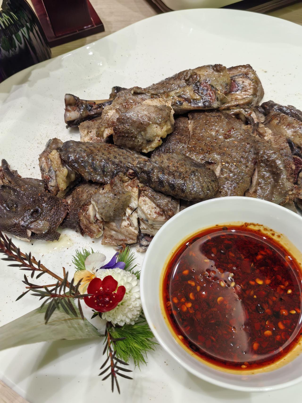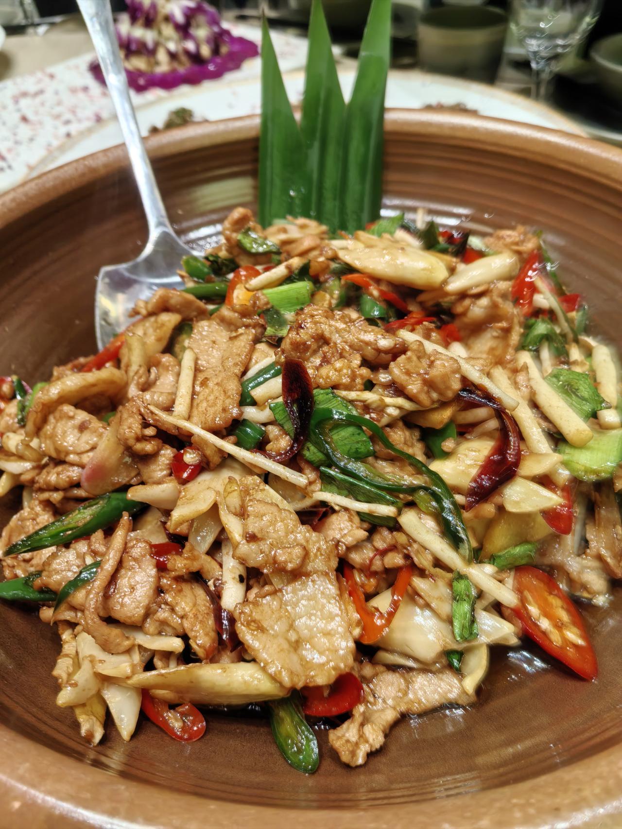 野佐料石榴花炒土猪:石榴花的爽脆与土猪肉的油脂香完美融合,野趣十足。