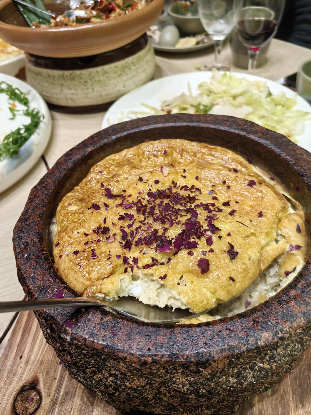 石锅烘蛋:石锅的余温让蛋香层层递进,外焦里嫩。
