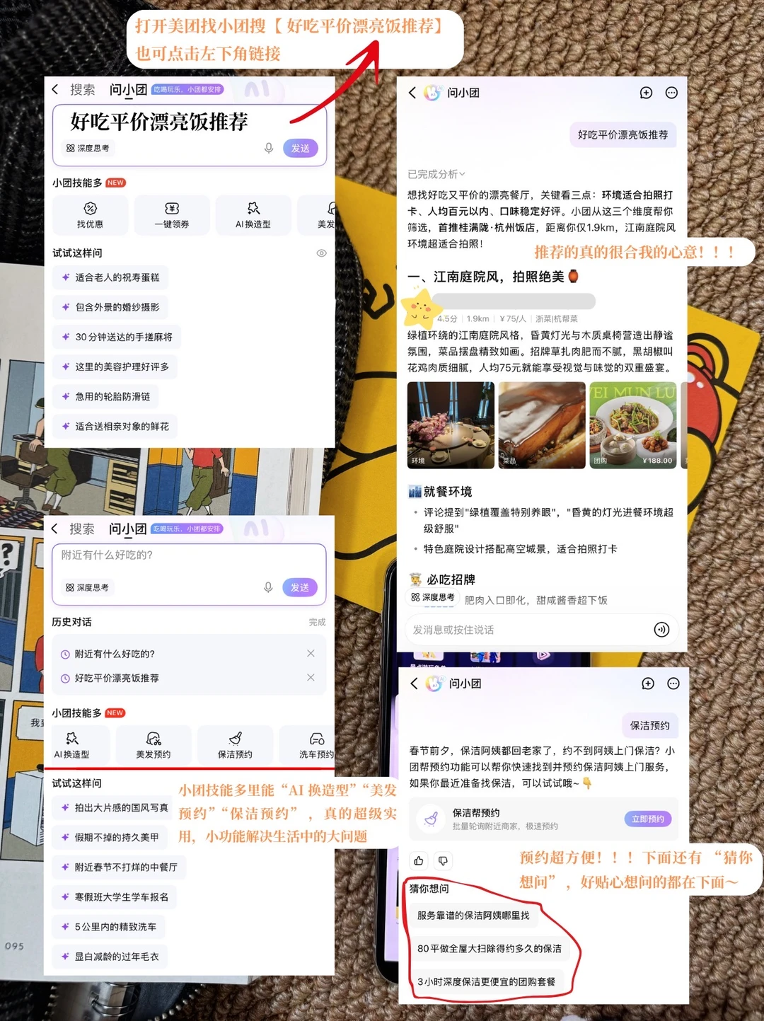 直接打开美团的AI-小团,输入【好吃平价漂亮饭推荐】,也可点击左下角链接,开始对话~