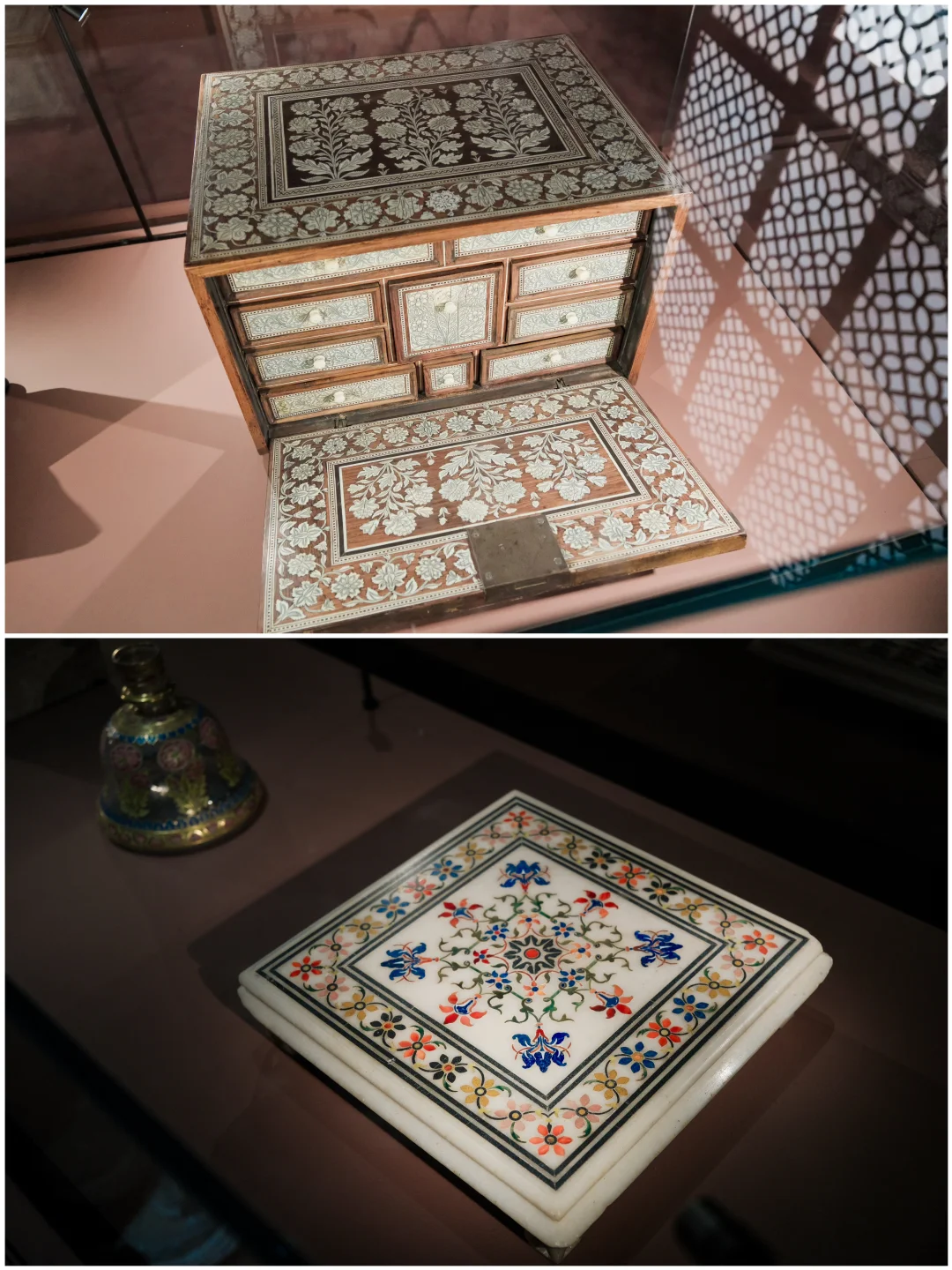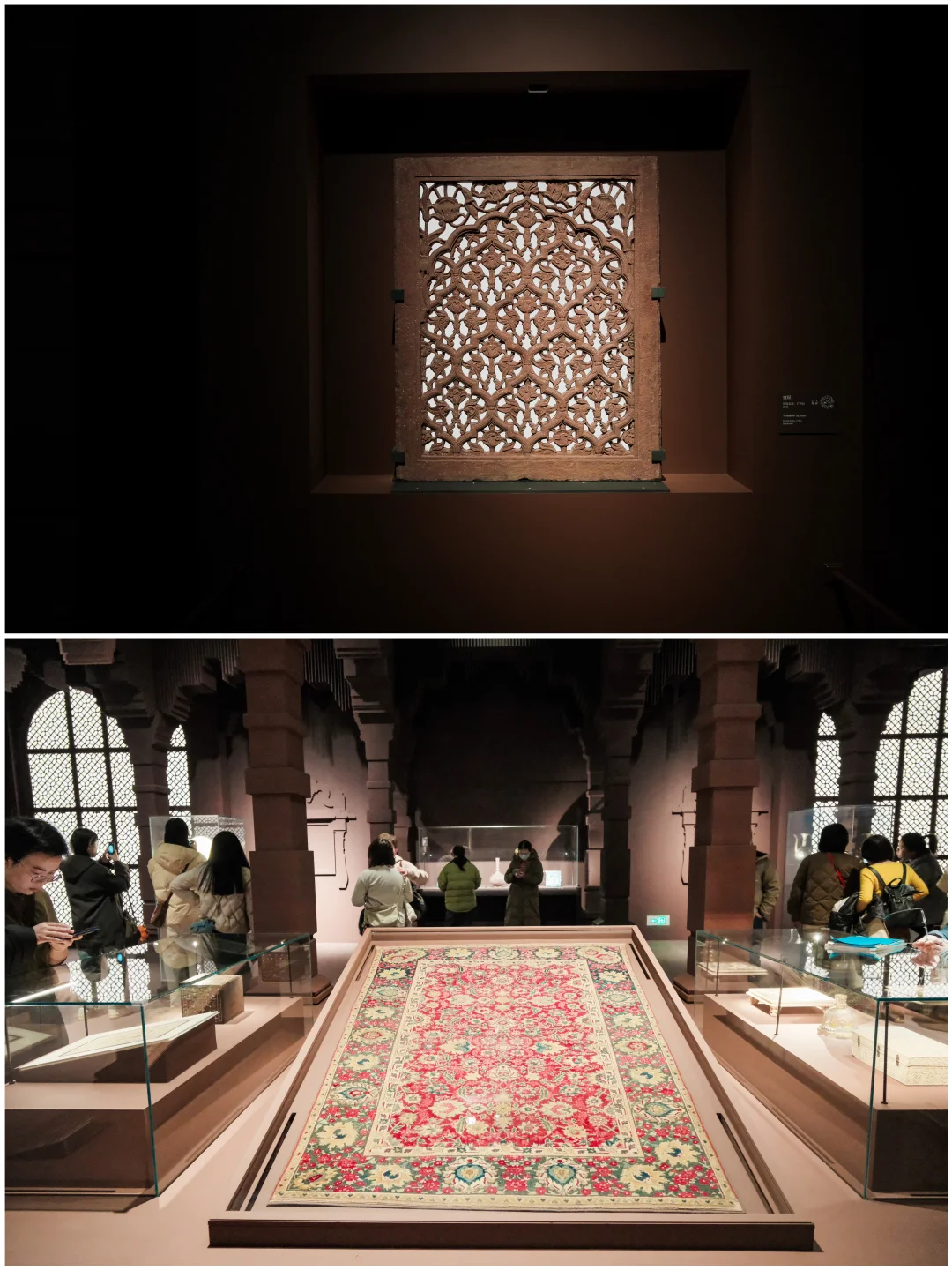 🏺印度板块:赭石色调还原当地砂岩质感,镂空贾丽窗屏美到窒息,精雕的植物纹样藏着光与影的哲思。