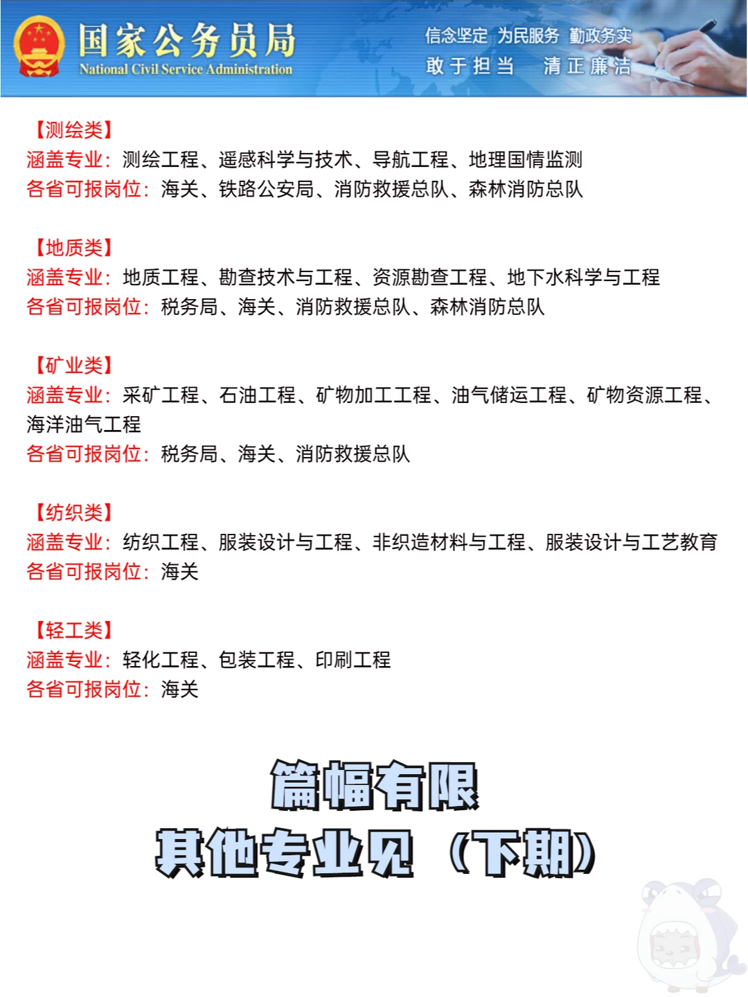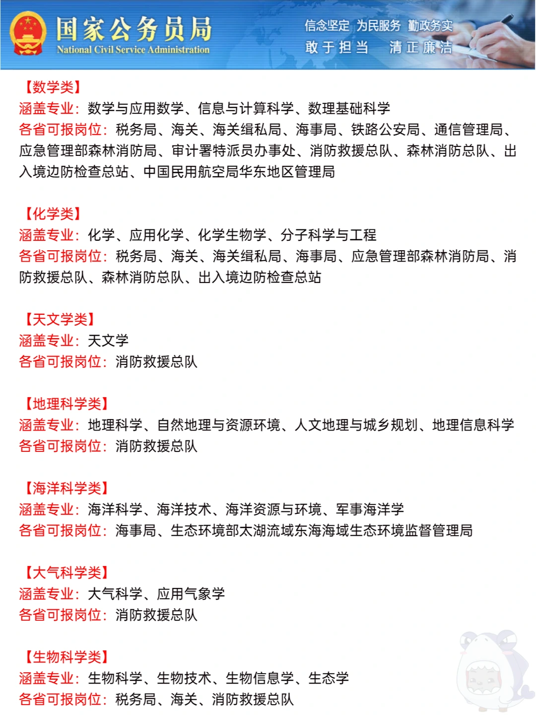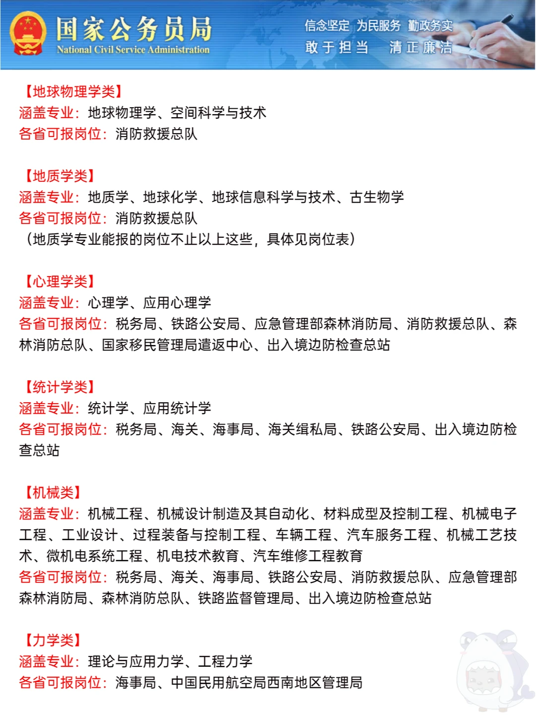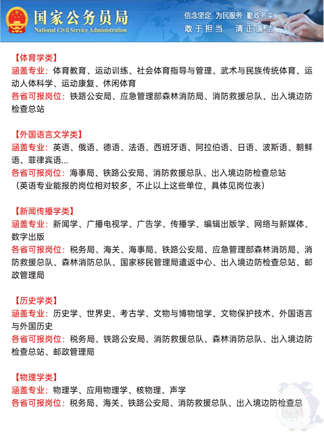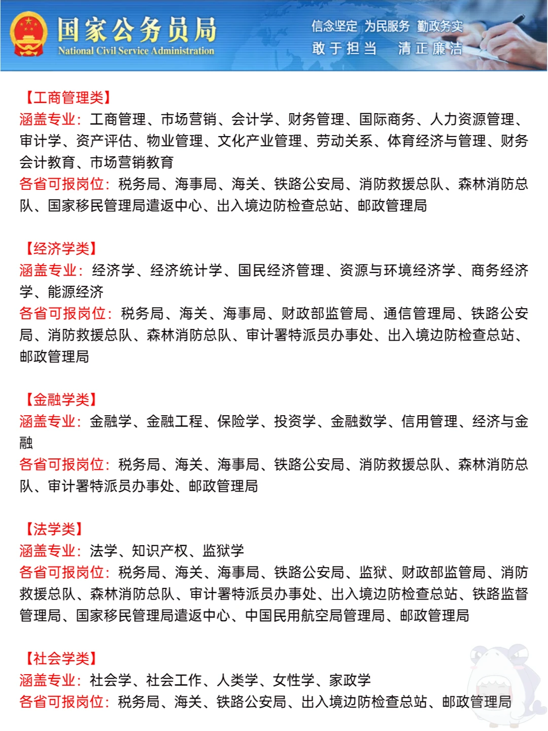 各省可报岗位:税务局、海事局、海关、铁路公安局、消防救援总队、森林消防总队、审计署特派员办事处、出入境边防检查总站、邮政管理局